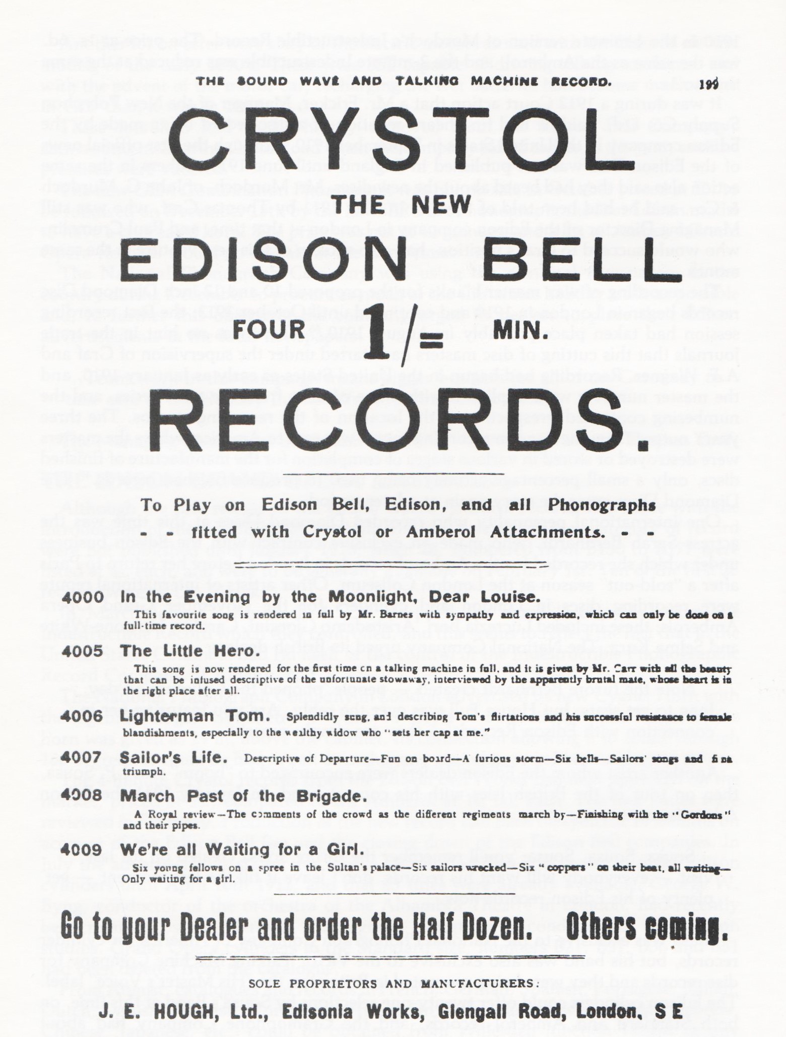 The Crystol was advertised as a four minute cylinder and the Ebonoid claimed to play for five minutes.