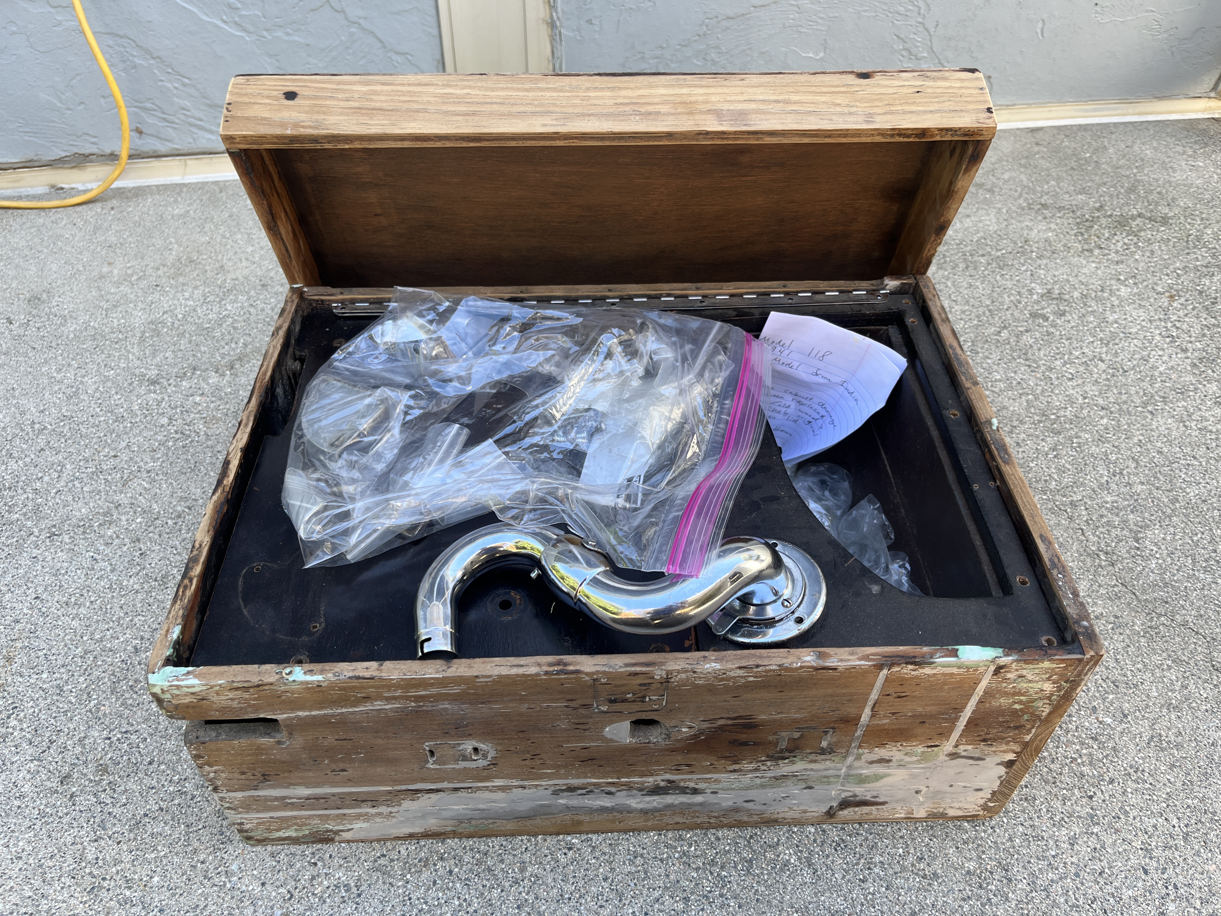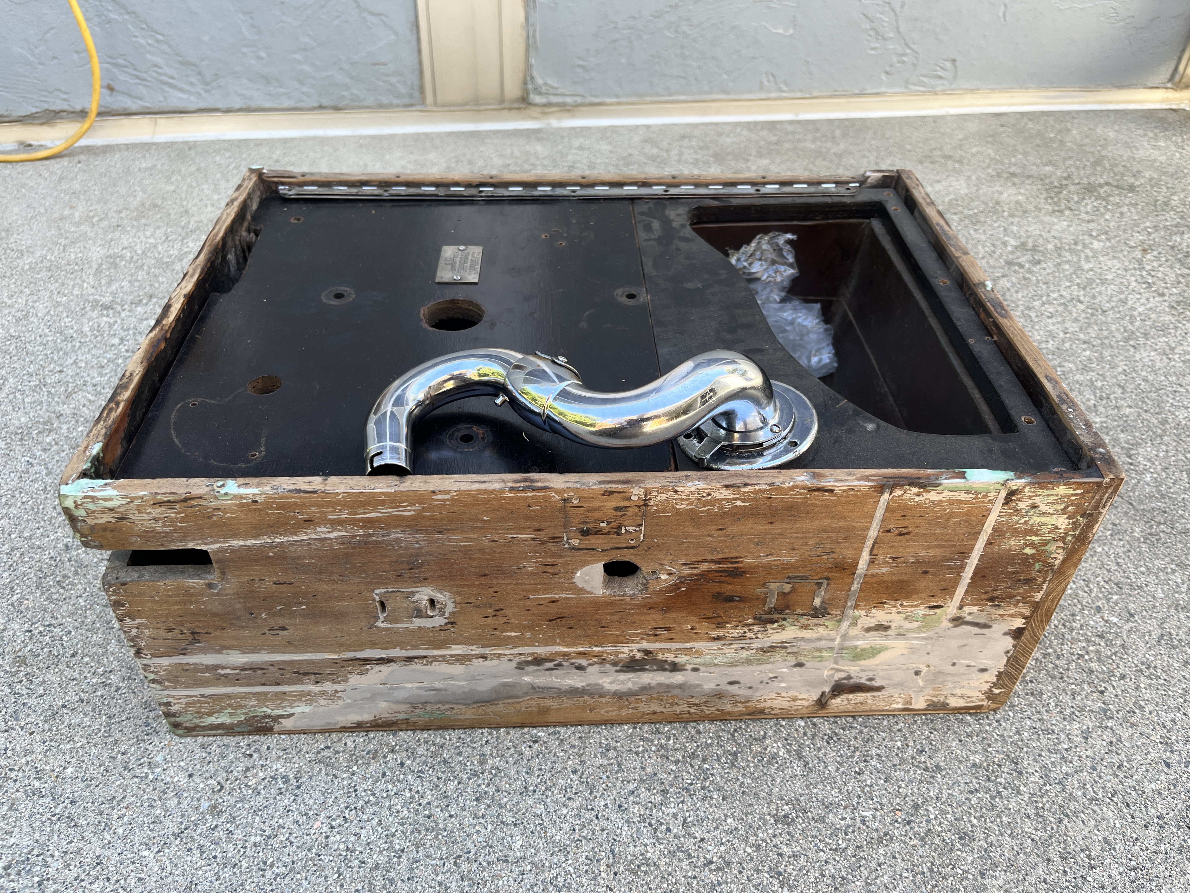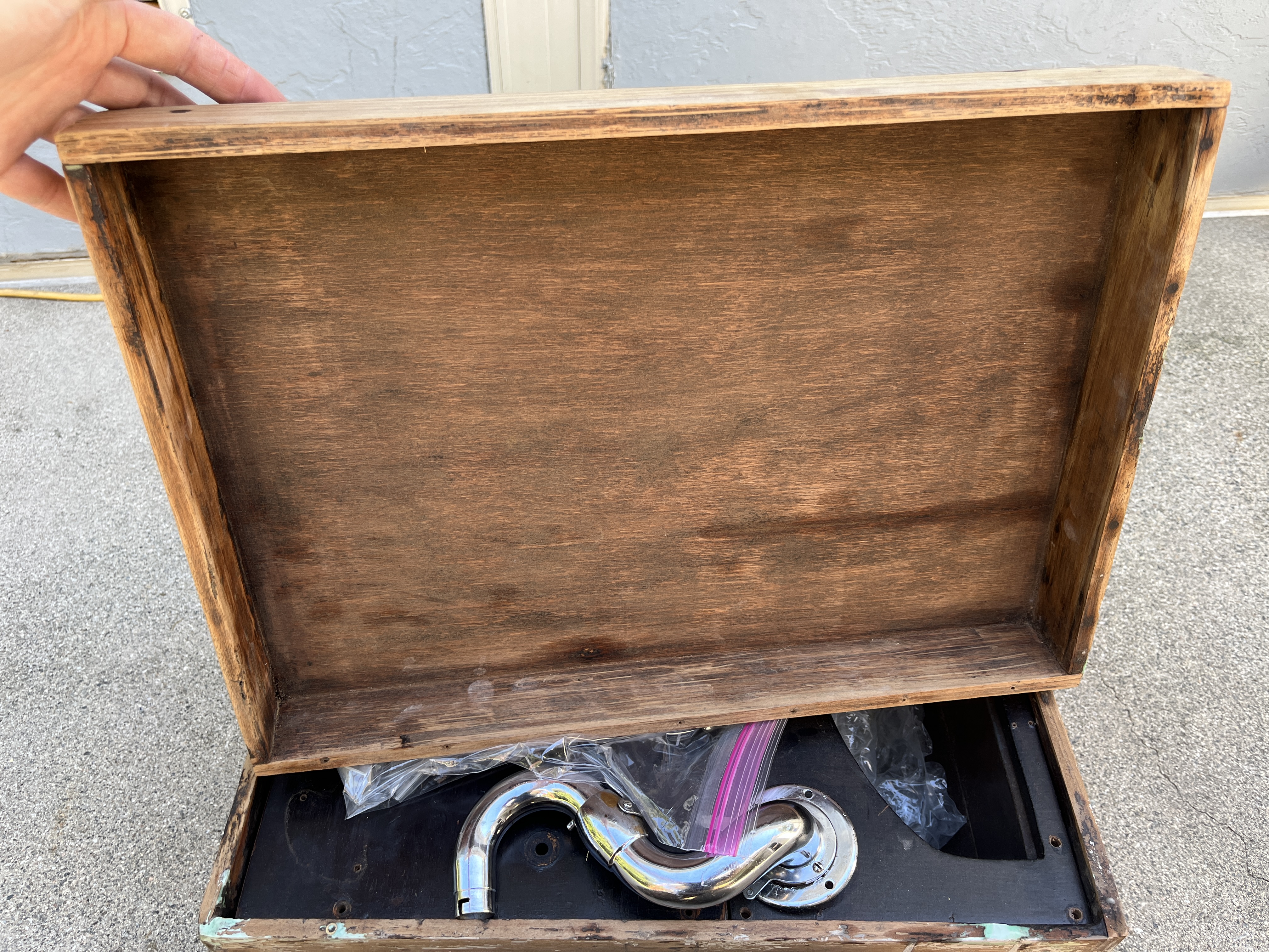 Here are some parts to a very rare colonial 118 portable in teak. Case is pretty awful, but the horn is present and there is the tonearm and various other parts. No motor, no soundbox, etc. see photos.