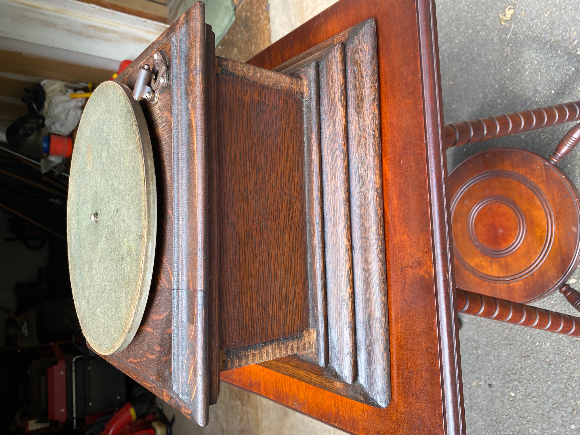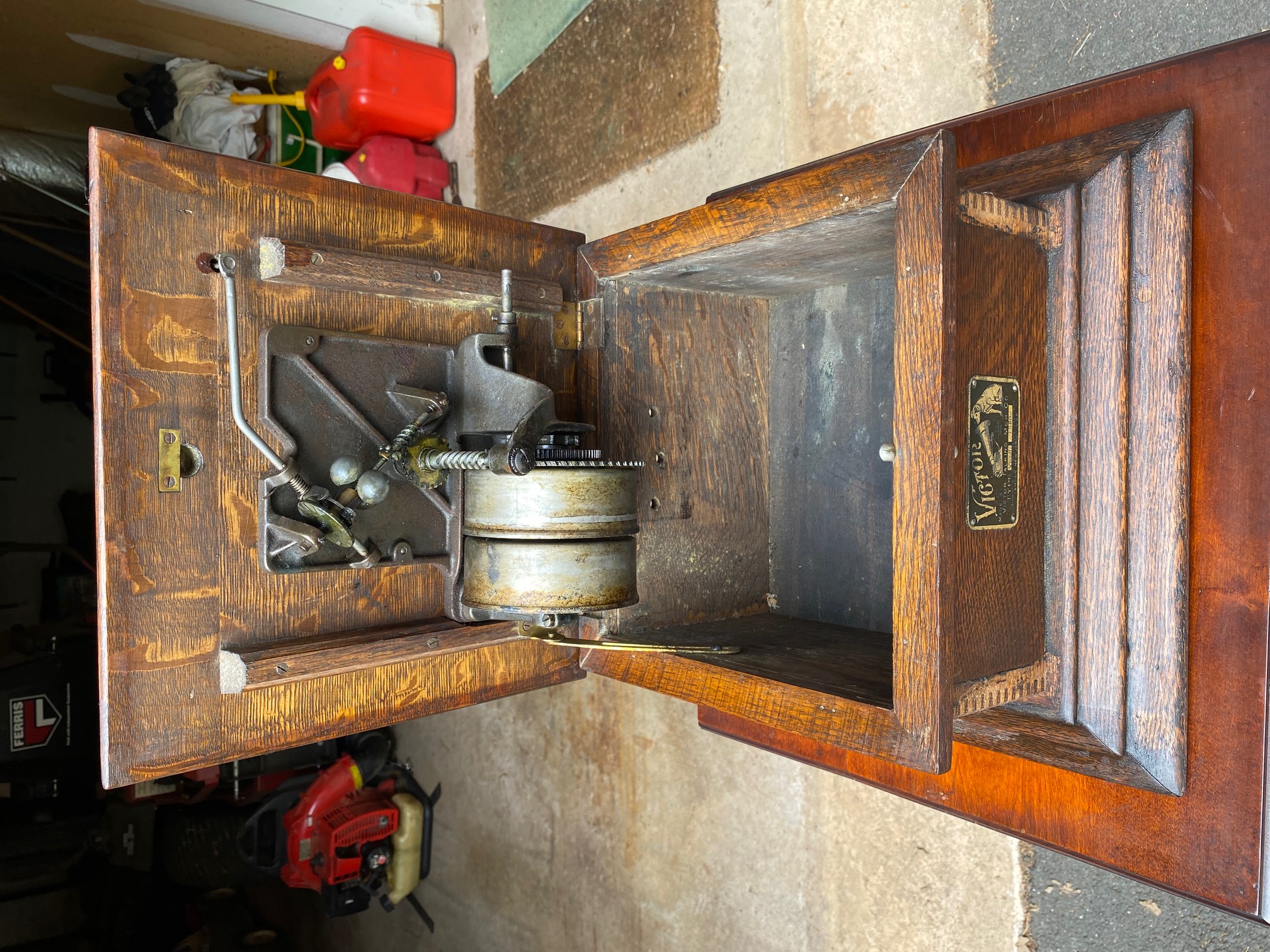 Hi, I have available an early Victor III. Motor winds and works well, decent turn table with original felt, brake, escutcheon and Vic III Serial tag. If you have a complete case this will work great for you. Obvious in the picture the case is missing corner columns and should be refinished . I can deliver to the Midwest Phono Show in Schaumburg on June 27th/28th at no additional charge. Please email, text, call or PM to purchase. John Duffy 860-966-2827.