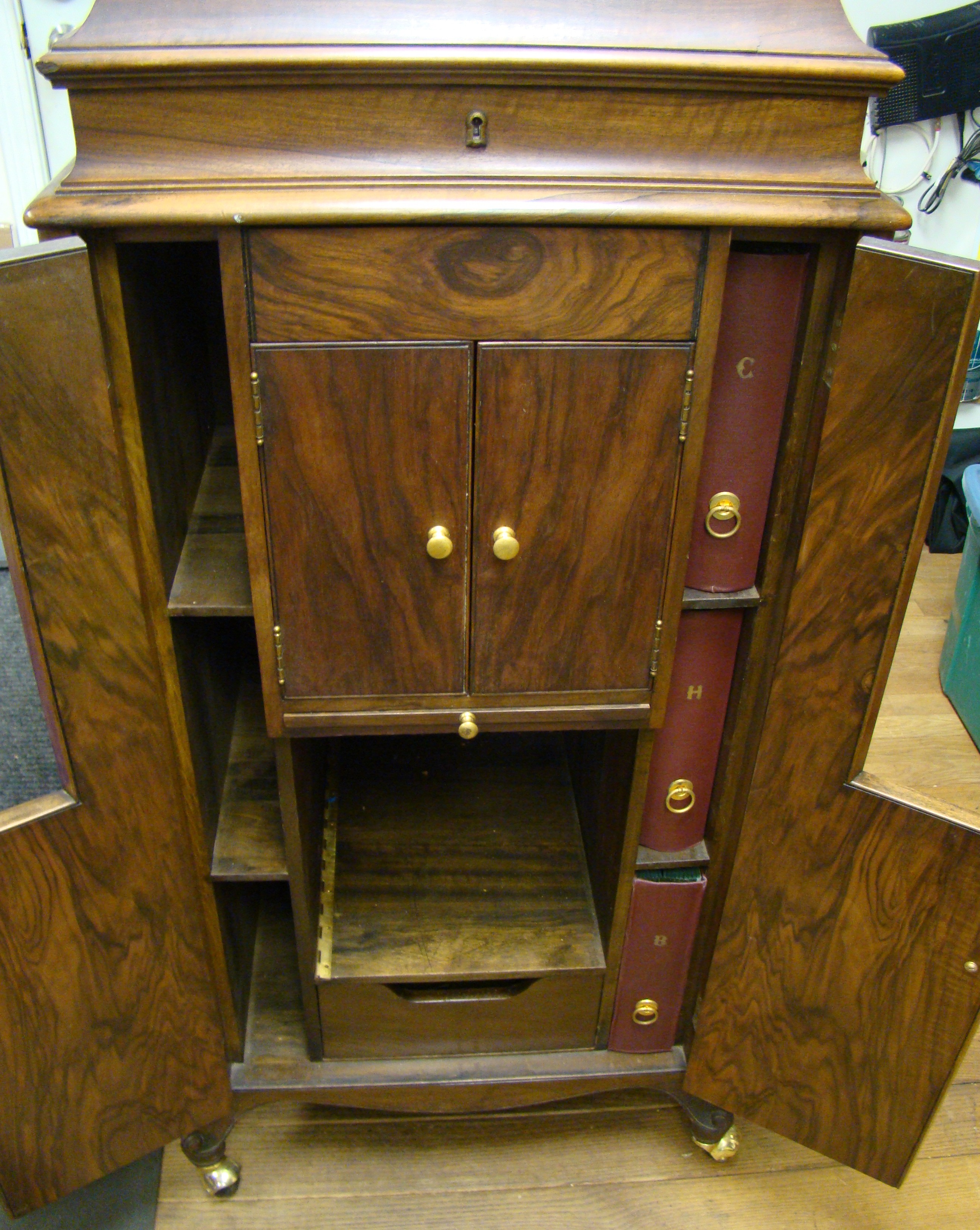 Pictured is a Victor XVI in Circassian walnut with an original finish. I do have the original castors. The castors currently on the phonograph allow it to roll better on the shop floor. Send a massage for more information.