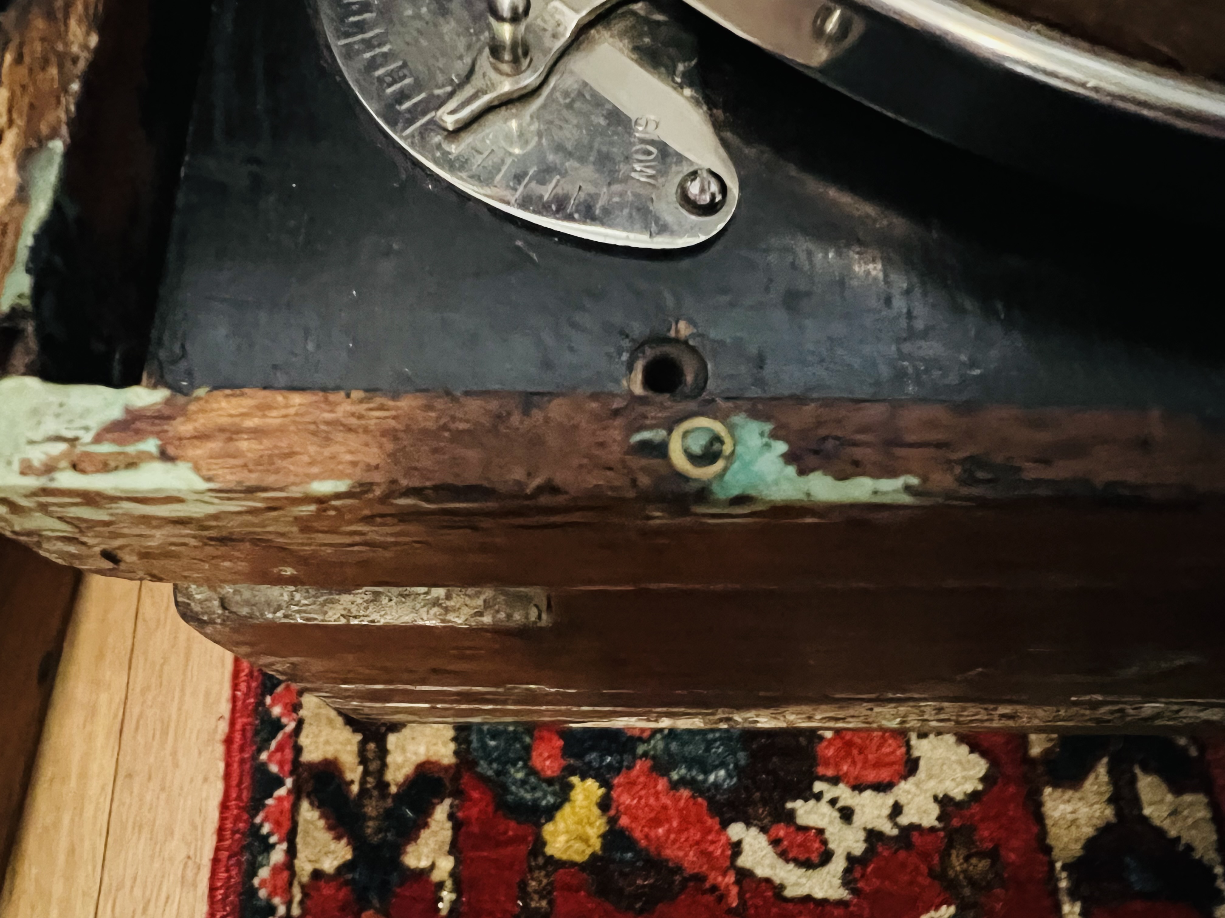 Late madel also hasn’t got locating pins for the lid. Mahogany tinted nitrocellulose lacquer on the late model has lost most of its transparency on the outside. Motorboard shows the original luster. Early motorboard is has been coated with a black tint. Inside the cases early one is also blacked, late one is the same as top coats.