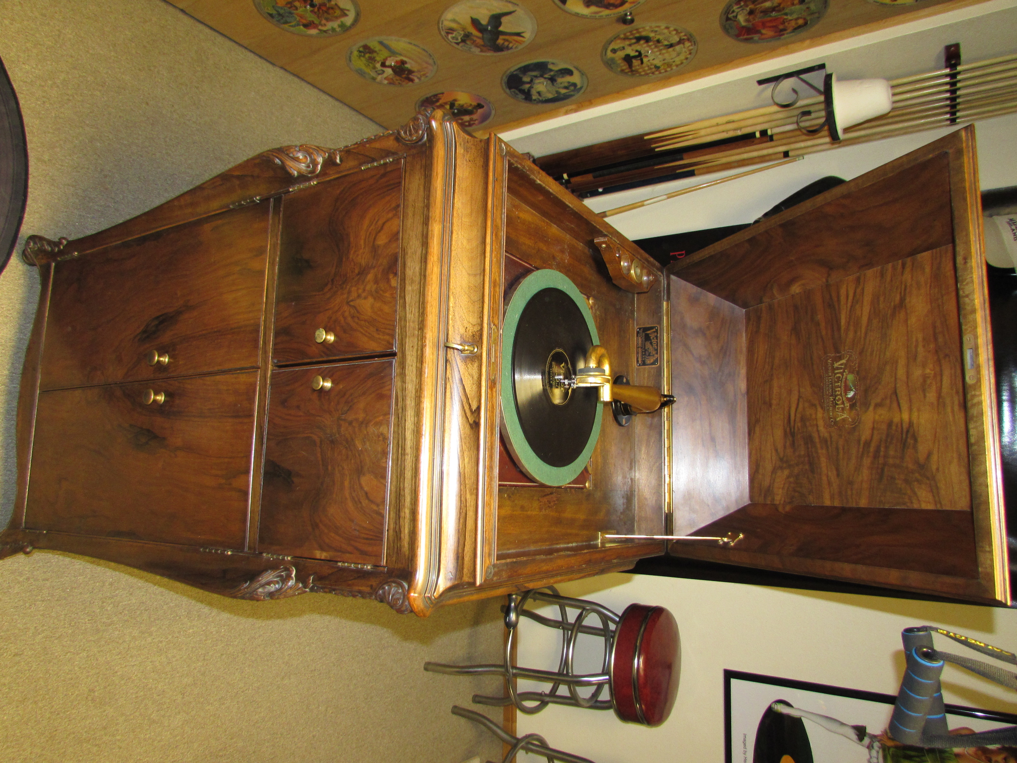 This is in great condition including the nice original finish. Motor is strong and silent. The Exhibition reproducer has been overhauled with new gaskets and back flange. The motor bedplate is the identical model XVI but it is a mahogany one. It doesn't look too bad and I suppose it could be stained to look more of a walnut. A walnut veneer would work too. I'm on Hwy 20 in Evansdale Iowa a straight shot 4 hours west of the Schaumburg Show this week. Or as long as payment is forthcoming I can hold it until pickup arrangements are made. It's really beautiful. Look at the dozen detailed photos and call or email....thank you. Craig NO text 319-215-3595 or email [email protected]