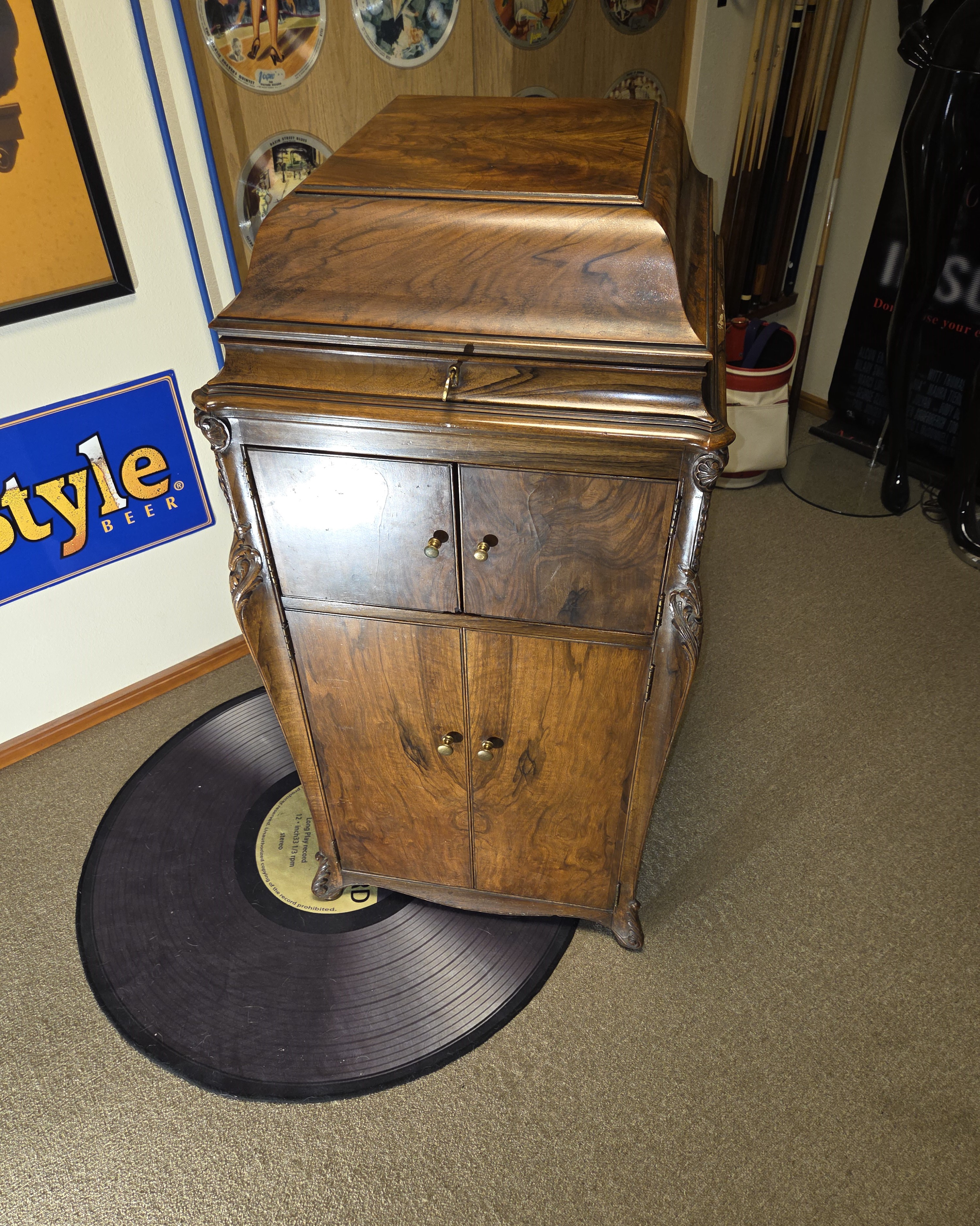 This is in great condition including the nice original finish. Motor is strong and silent. The Exhibition reproducer has been overhauled with new gaskets and back flange. The motor bedplate is the identical model XVI but it is a mahogany one. It doesn't look too bad and I suppose it could be stained to look more of a walnut. A walnut veneer would work too. I'm on Hwy 20 in Evansdale Iowa a straight shot 4 hours west of the Schaumburg Show this week. Or as long as payment is forthcoming I can hold it until pickup arrangements are made. It's really beautiful. Look at the dozen detailed photos and call or email....thank you. Craig NO text 319-215-3595 or email [email protected]