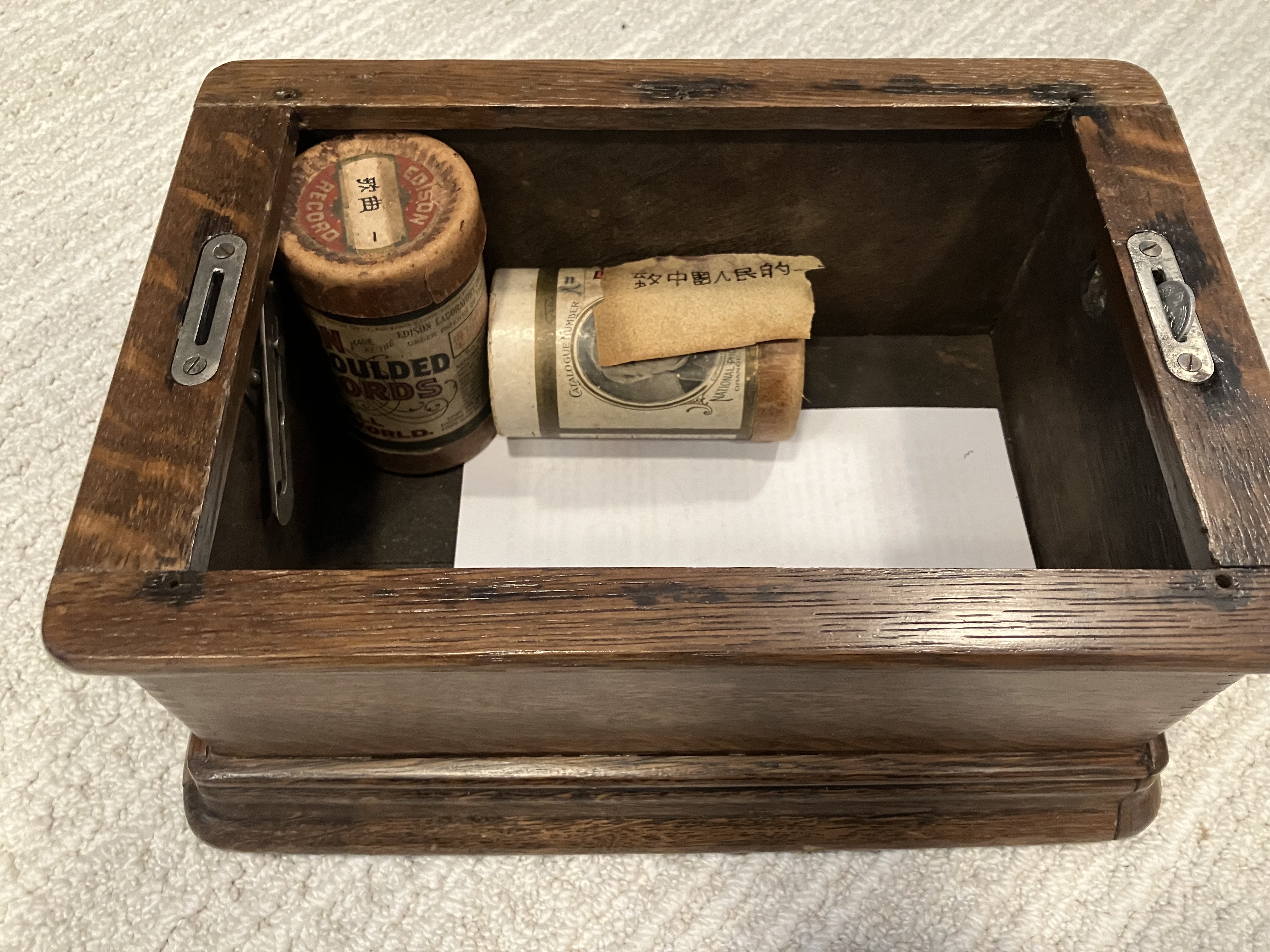 There were 2 cylinder containers inside, 1 has a cylinder in it. The first container reads "Song 1" and also "Edison Records". The second container reads "People Two"- both are sloppily written. I think the second one is incorrect.