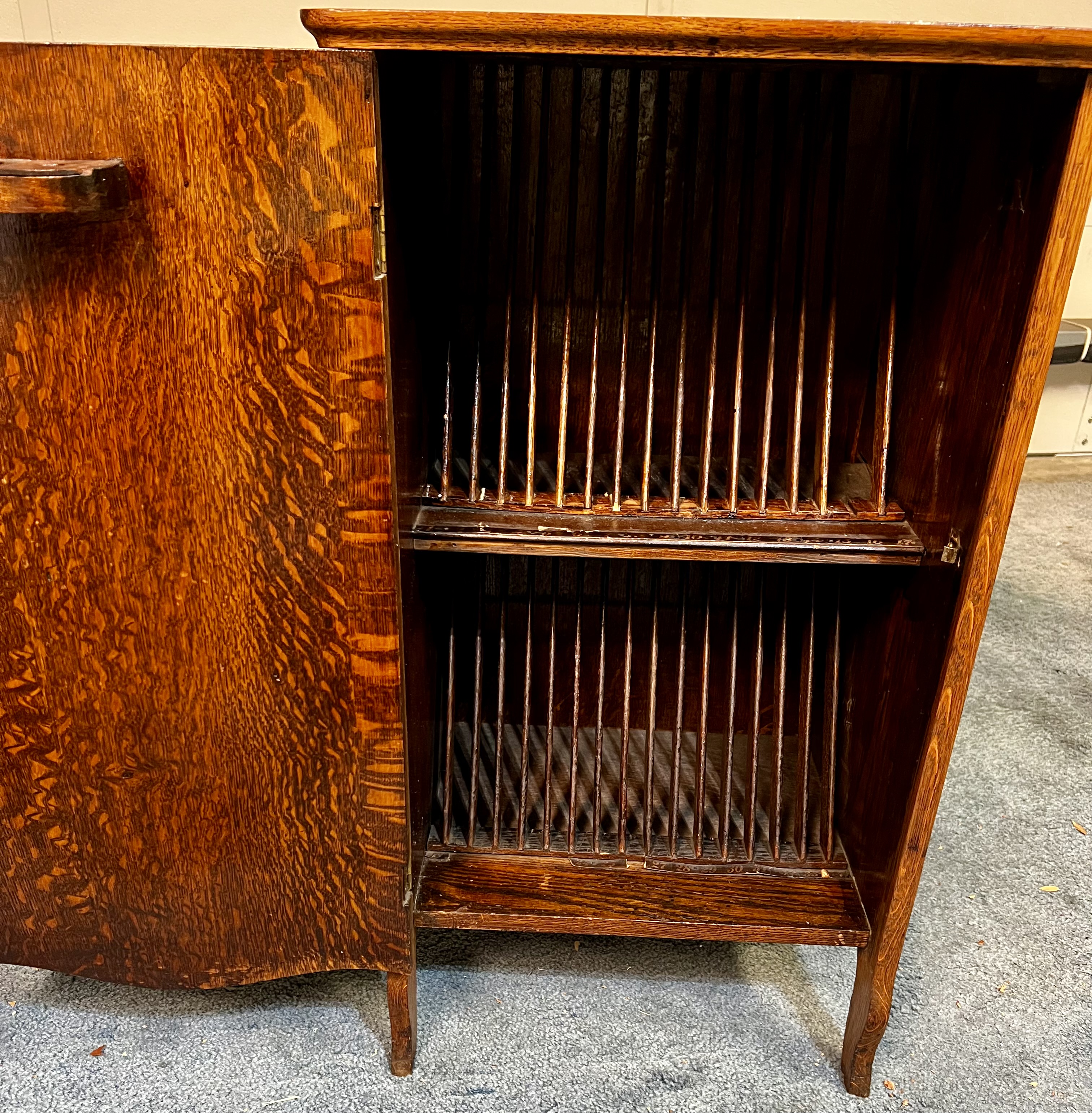 Oak disc cabinet with vertical slats. Original finish in a nice sized cabinet. Needle holder in door.
