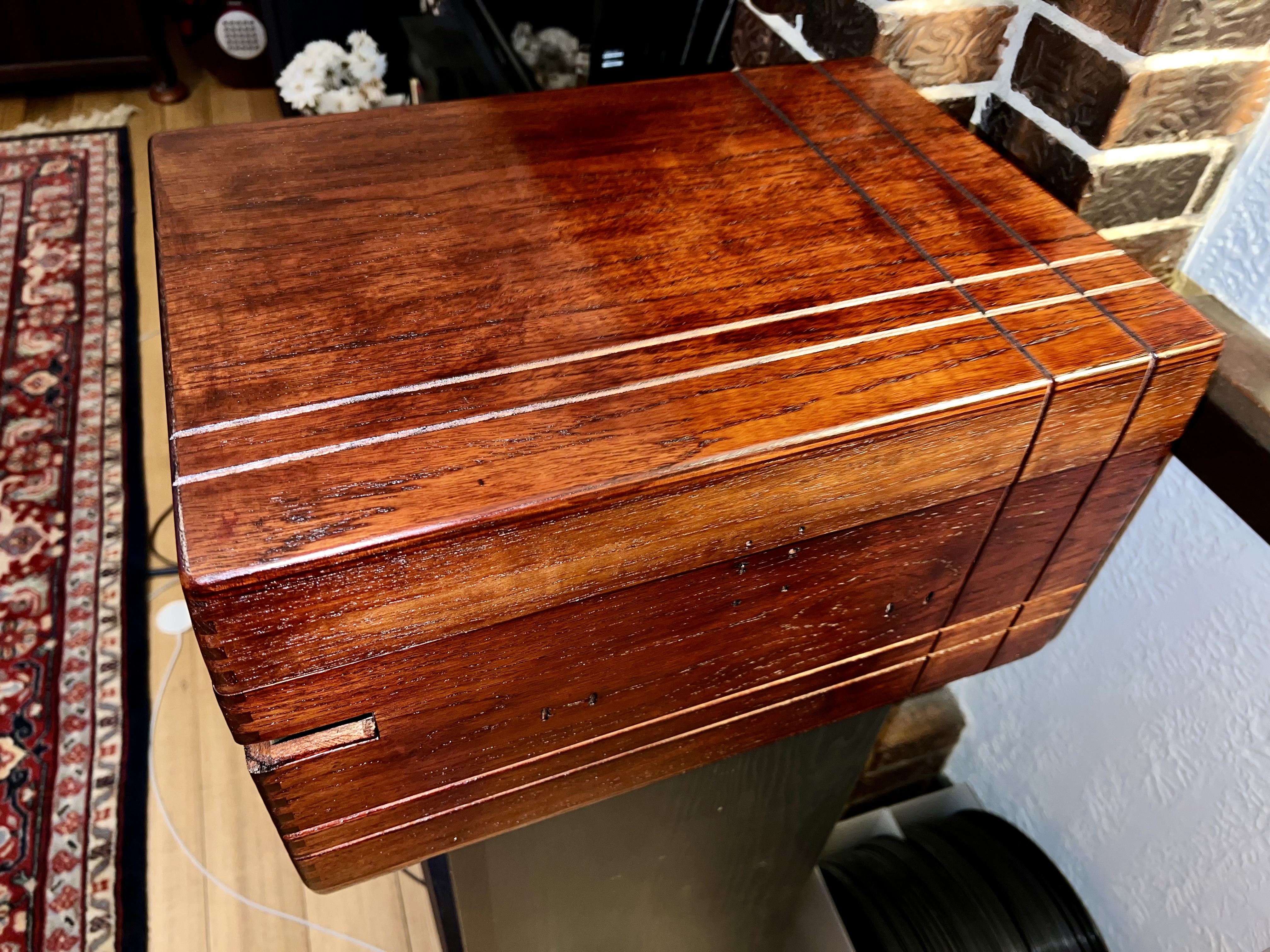 Mahogany tinted teak. Next step is filling the grain with pumice and french polishing to mirror finish. This is not the final colour yet. It is gonna get deeper and more even. Black bands is the final touch then.