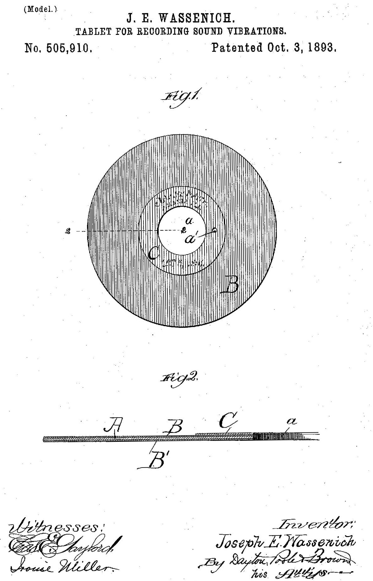 June 29, 1891: Joseph Wassenich filed for a U.S. patent for a “Tablet for Recording Sound Vibrations.” This was the first known envisioning of a flexible, 2-sided disc with a paper label, and a secondary hole (as adopted by Zonophone in 1900).