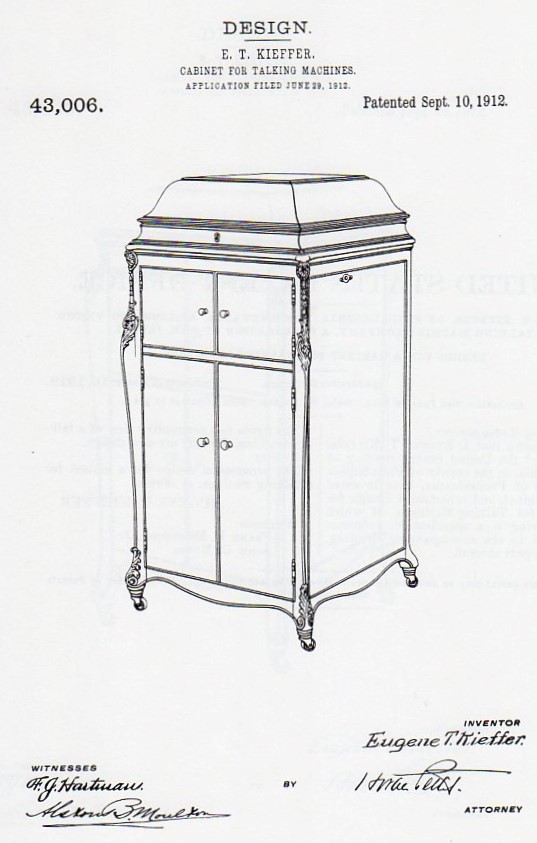 June 29, 1912: Eugene Kieffer filed for a U.S. Design Patent (eventually granted as No. 43,006) for “Cabinet for Talking Machines.” This would become the cabinet for the Victrola XVI.