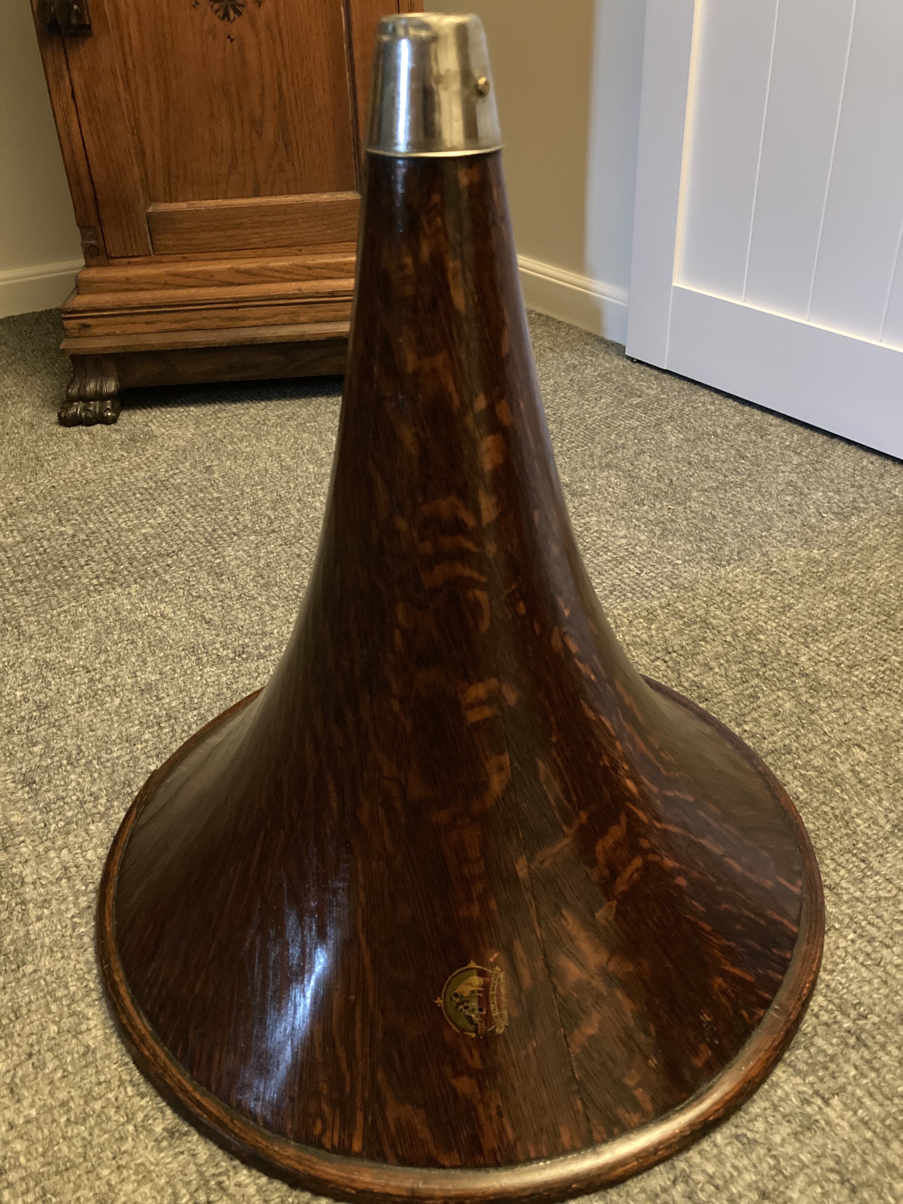 SOLD: Victor Smooth Oak horn. Original condition as found. Two small holes on decal (note pic) can be easily filled to match area. Tight crack .... not a significant issue and not a distraction. If someone was so inclined, they could very easily refinish this horn making good any imperfections from it 100+ year history and making look as new. I always lean original. Very nice horn. Size good for models such as Vic II or III. View pics and ask any questions. asking $600