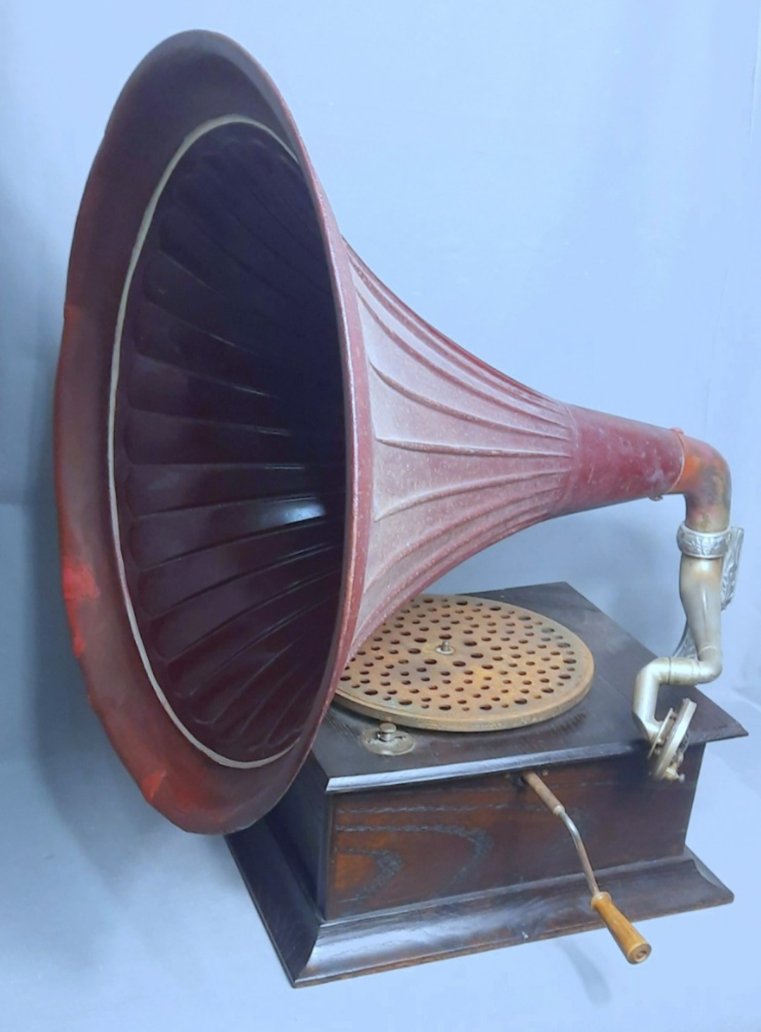 I looked closely at the photos, and noticed that the patina under the front panel didn't quite seem to match the other sides. Also, the glue blocks in front are different from those in back: this may indicate a conversion from a 'hornless' model.Sidewinder wrote: Sun Jul 06, 2025 3:57 am At first glance I thought it was a converted tabletop as one sees here at the 3rs set of pictures - the HMV tabletop conversion