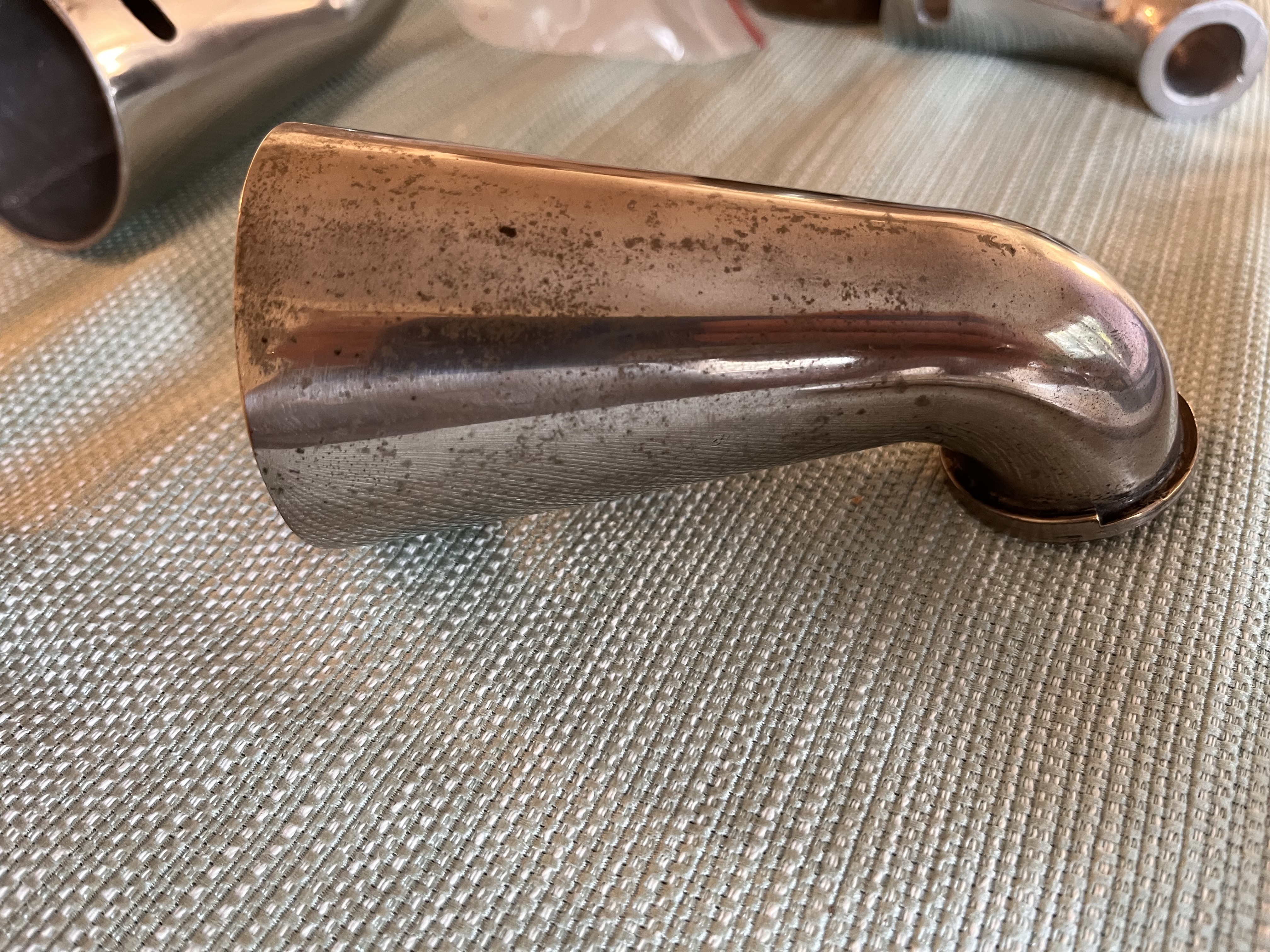 The second elbow is also the size of a Victor II. It is a reproduction and made from aluminum. This makes the sides a little thicker than the copper used on the factory made elbows. The elbow is highly polished and looks good. I want $85 for the elbow.