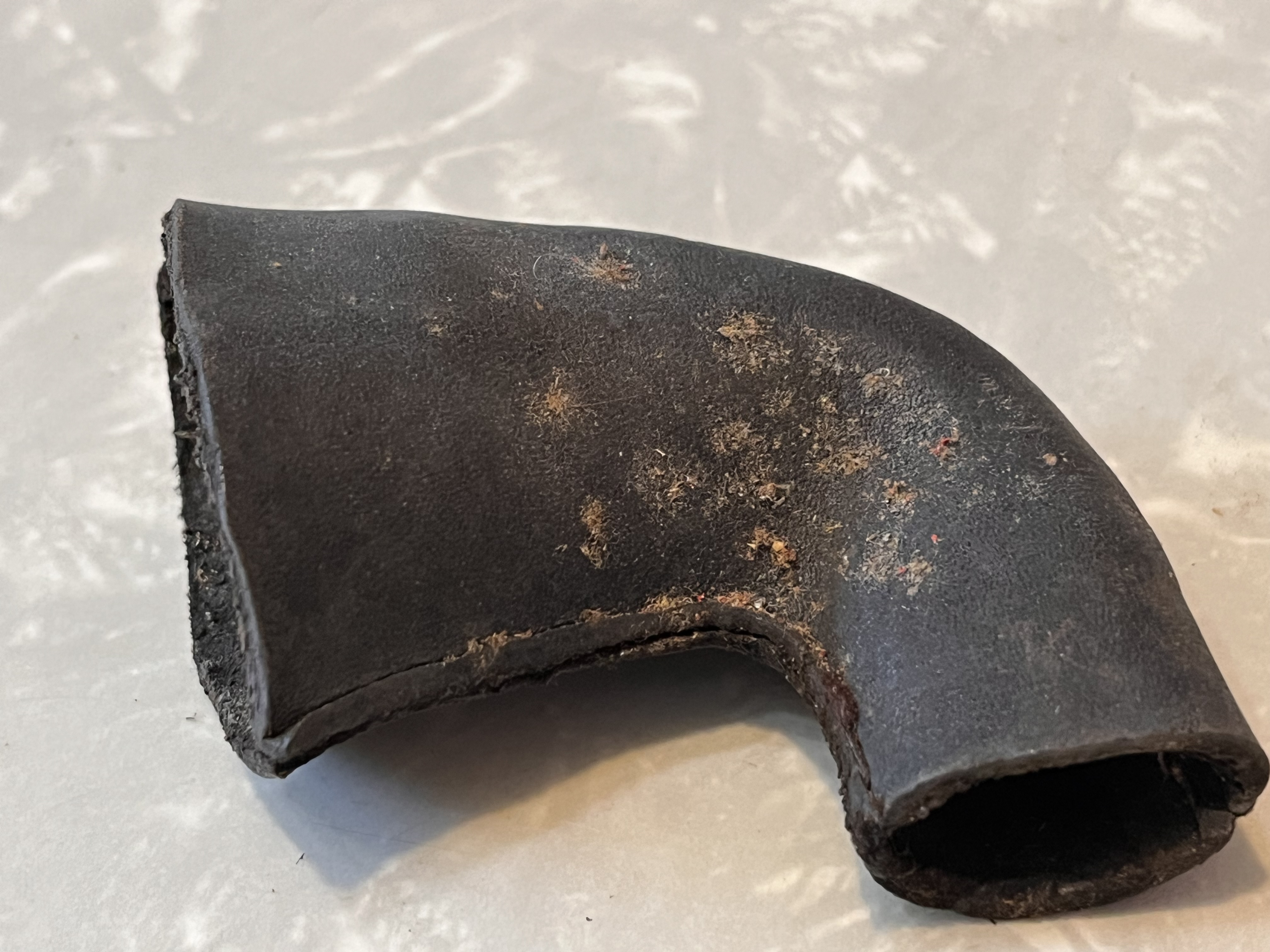 The last item is a leather elbow. The leather is still pliable. I believe it came from an early Victor or an early Berliner machine. I believe it to be old but I don't have any old oned to compare it to. I checked it against a reproduction on that I have and it is definitely different. It is smaller and the stitching is different. See the pics of them side by side. I want $60 for it plus shipping and insurance. SOLD
