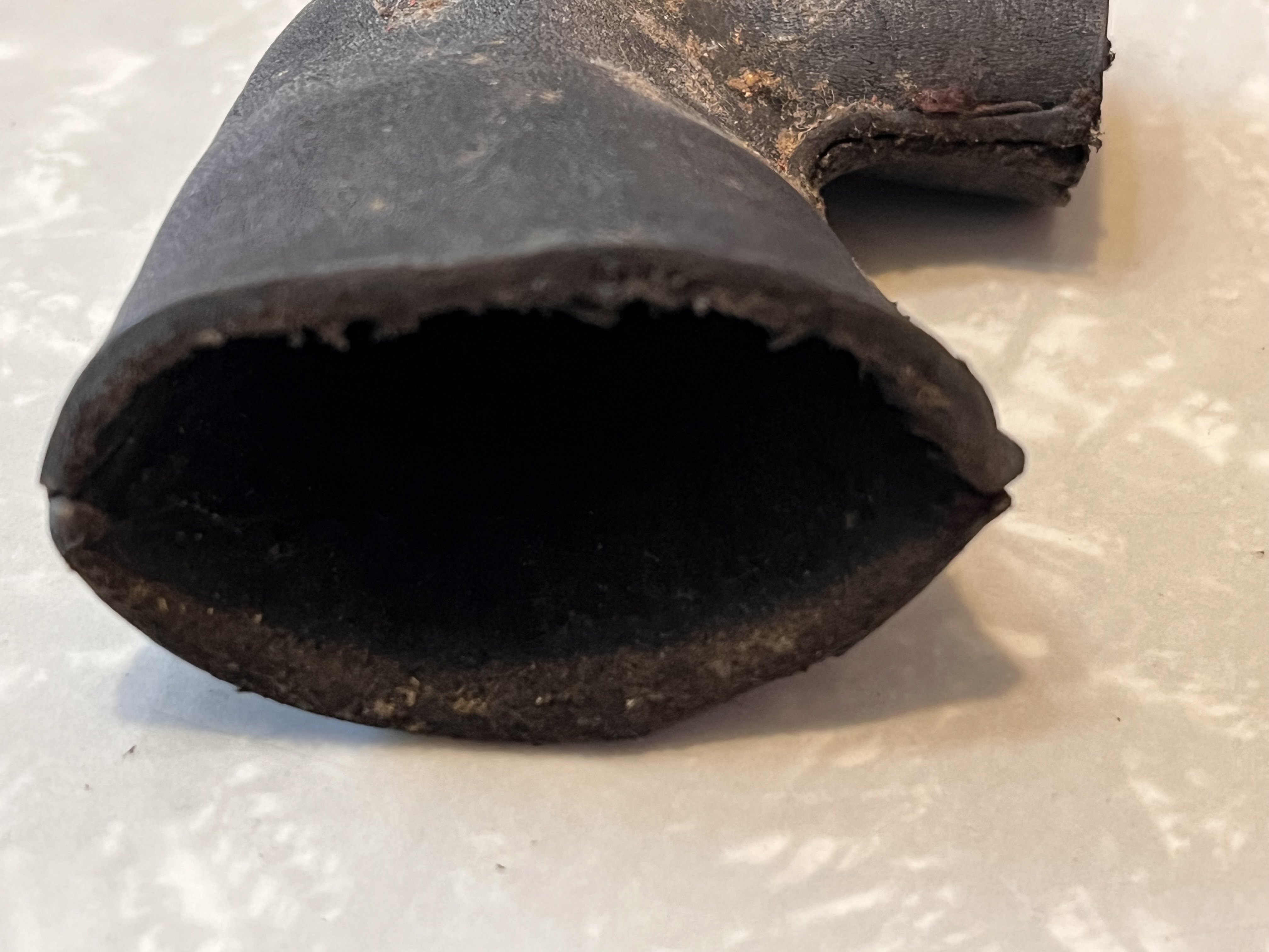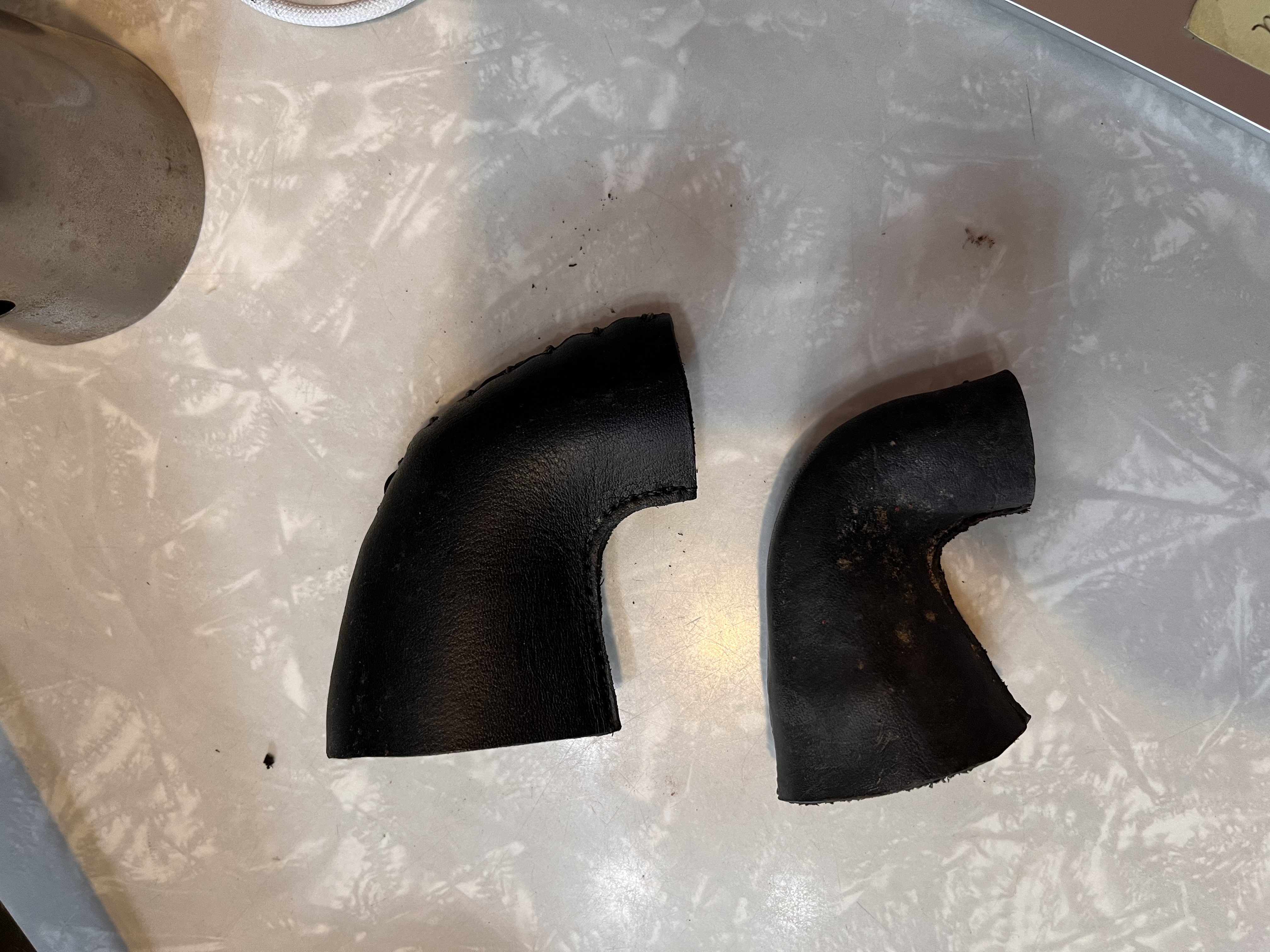 The last item is a leather elbow. The leather is still pliable. I believe it came from an early Victor or an early Berliner machine. I believe it to be old but I don't have any old oned to compare it to. I checked it against a reproduction on that I have and it is definitely different. It is smaller and the stitching is different. See the pics of them side by side. I want $60 for it plus shipping and insurance. SOLD
