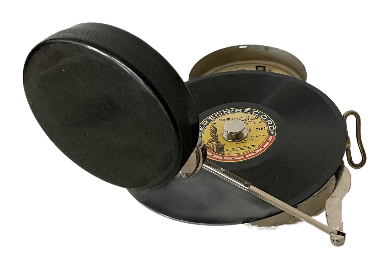 This example is all original, with a few nicks and dents, and some worn nickeling, that can be expected from 100 years of traveling around. The resonator (speaker) is original and undamaged. It plays up to 10" disks, and I will include several smaller disks.