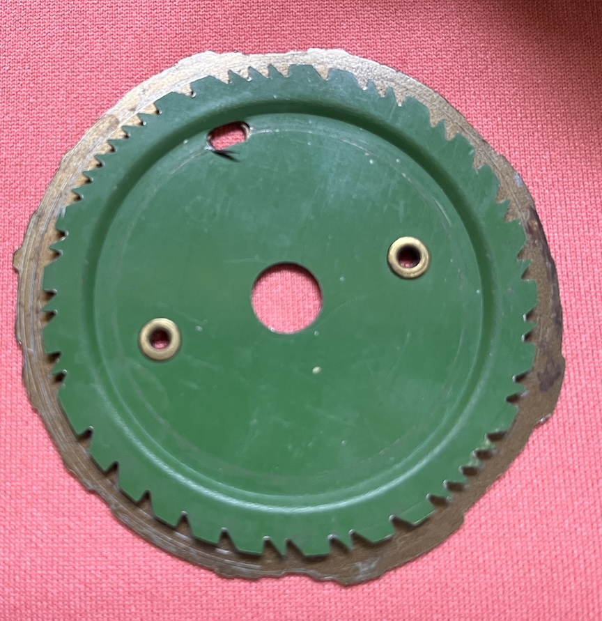 The final production model was considerably simplified and improved over the original patent by riveting a second serrated disk to the cam plate. Each serration acts through simple levers on a spring-loaded rod that runs through the body of the figure which in turn moves the arms and striker up and down. This has the great advantage of permitting phrasing in the music as wherever a tooth is not cut on the serrated disk a pause or rest will occur. These are synchronized with the notes selected by the contours of the cam disk to which the serrated disk is riveted.