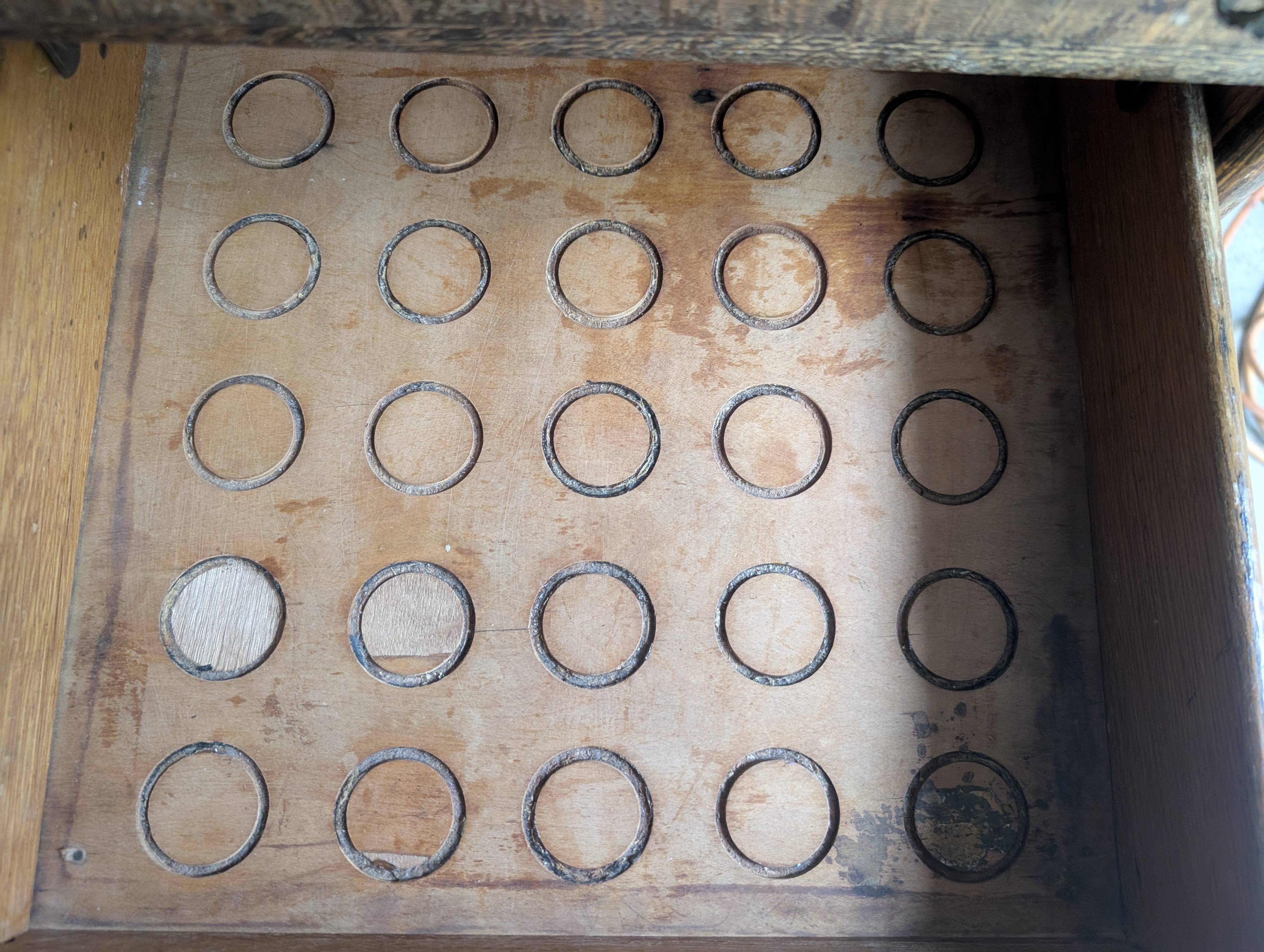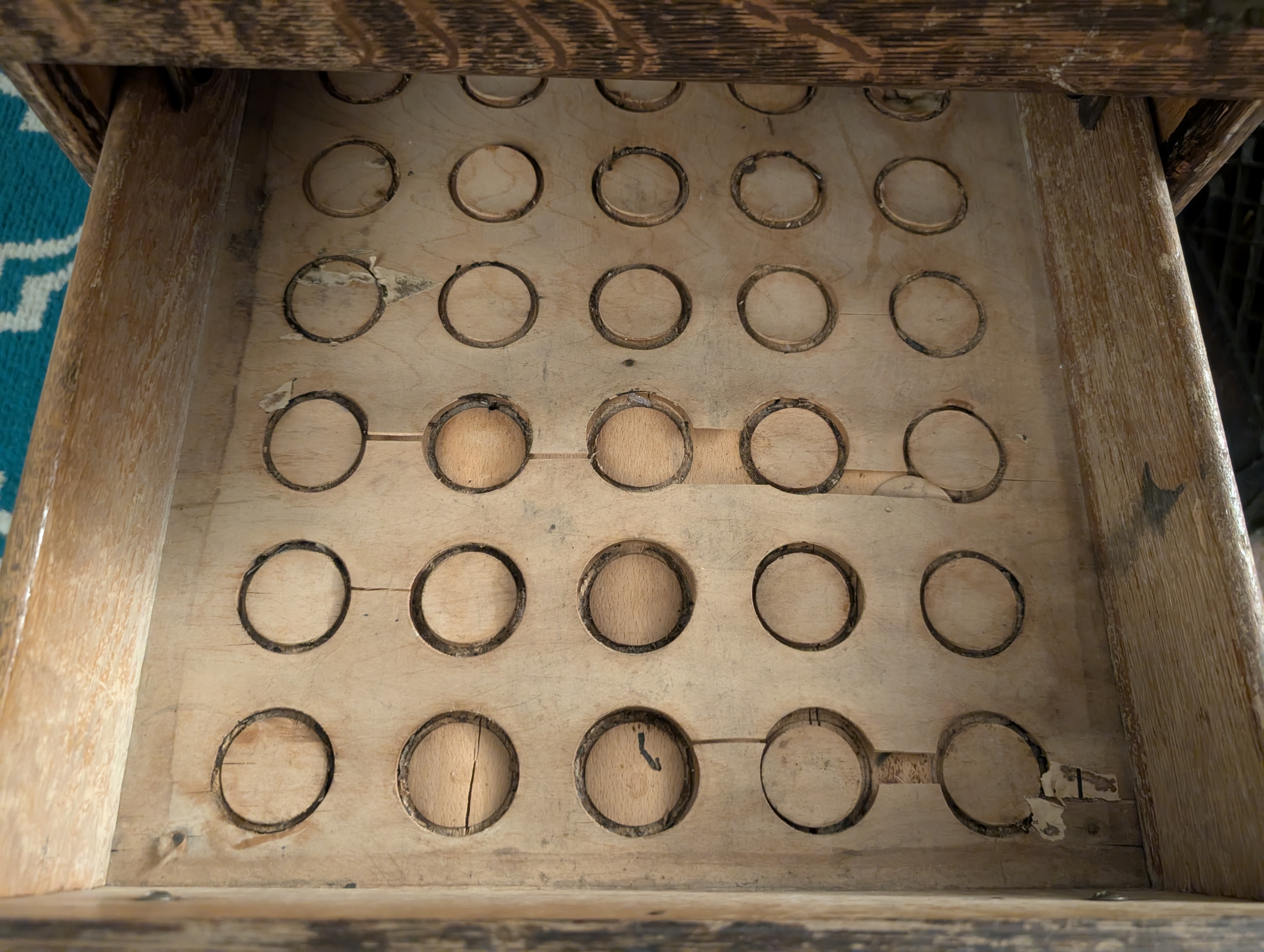 Thanks, Brad! That's all very helpful. I think, though, that I won't be able to restore the pegs, because the bottom of each drawer has buckling in it that would have to be fixed first. The photo is of the third drawer, which is by far the worst, but even though the buckling is not as severe in the other drawers, it is there to the extent that I cannot store encased cylinders in the for fear that I will not be able to open the drawer with them in there. This has already happened to me a couple of times, and I was very fortunate in that I eventually managed to get the drawers open again without damaging any cylinders, but for now I am storing the cases in them lying down. Eventually I will glue down the warped wood, but I will probably not replace the pegs -- I think that would be too much work. I am fine with storing the cylinders in their cases; I found the cabinet at an estate sale and it was very inexpensive.