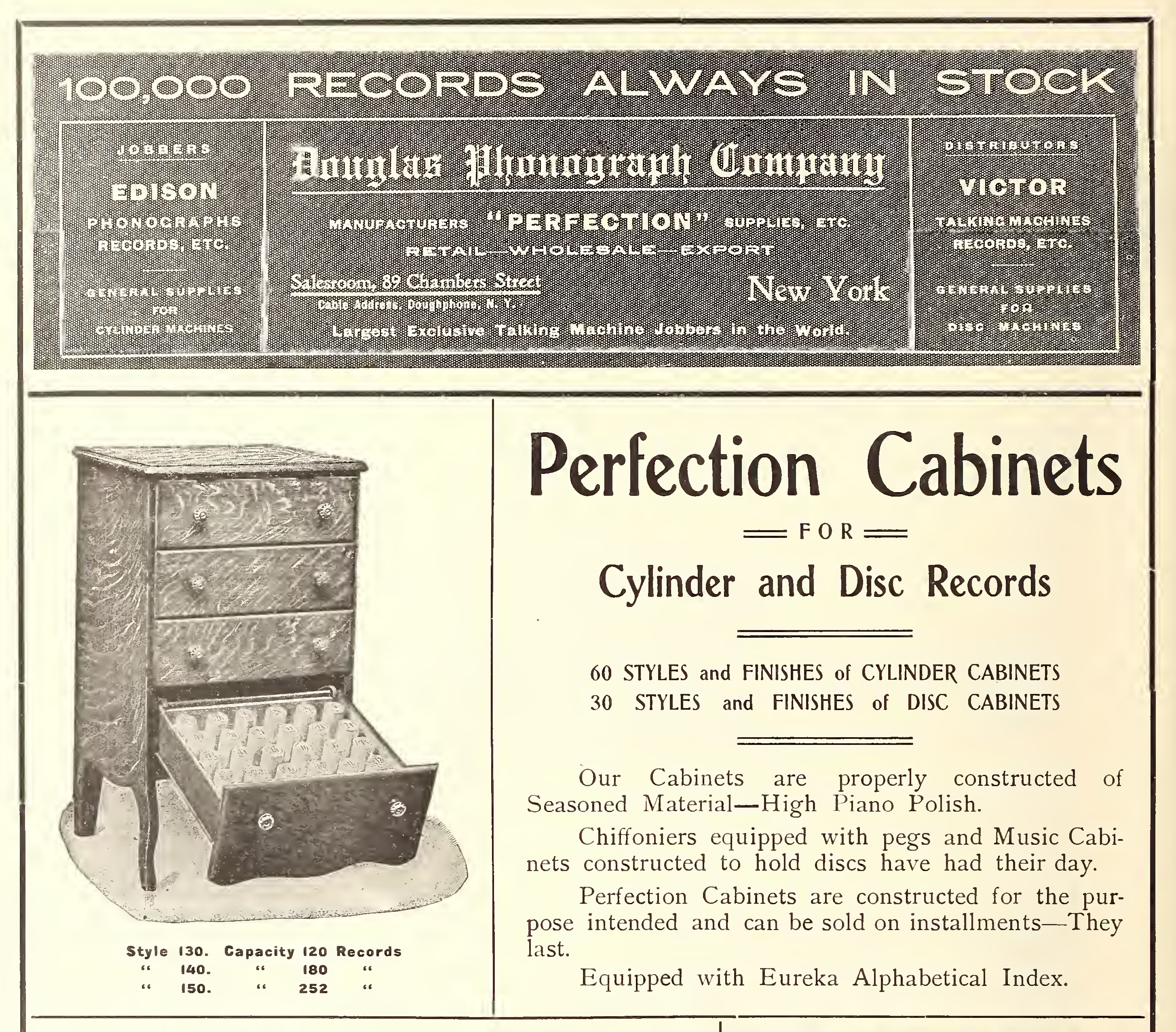 However, I do believe there is good evidence it was made by Douglas. Here is a 1906 ad from the Talking Machine World that shows a cabinet that is very similar, and of the same make as the one in this post.