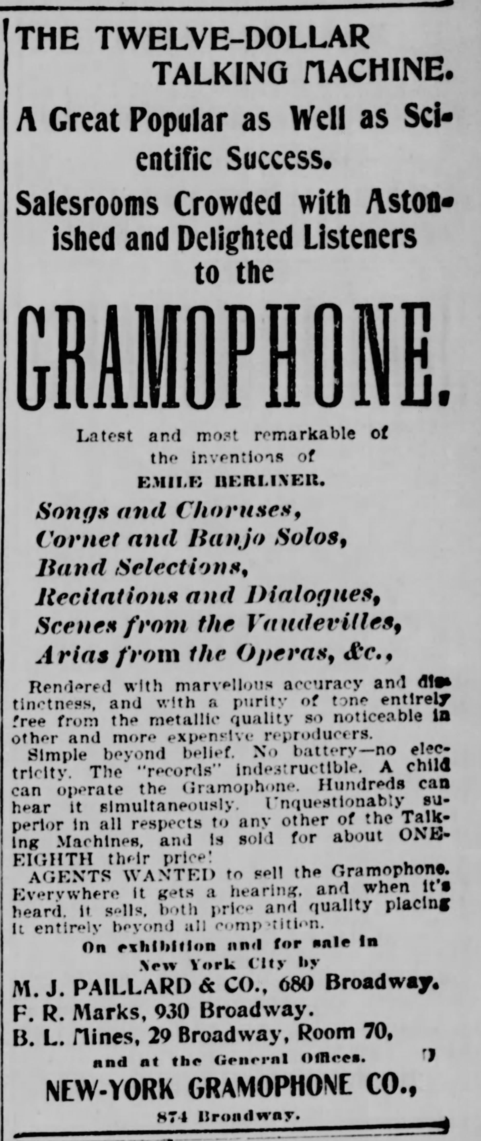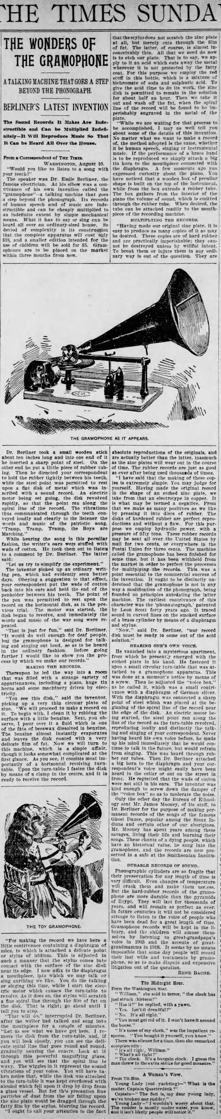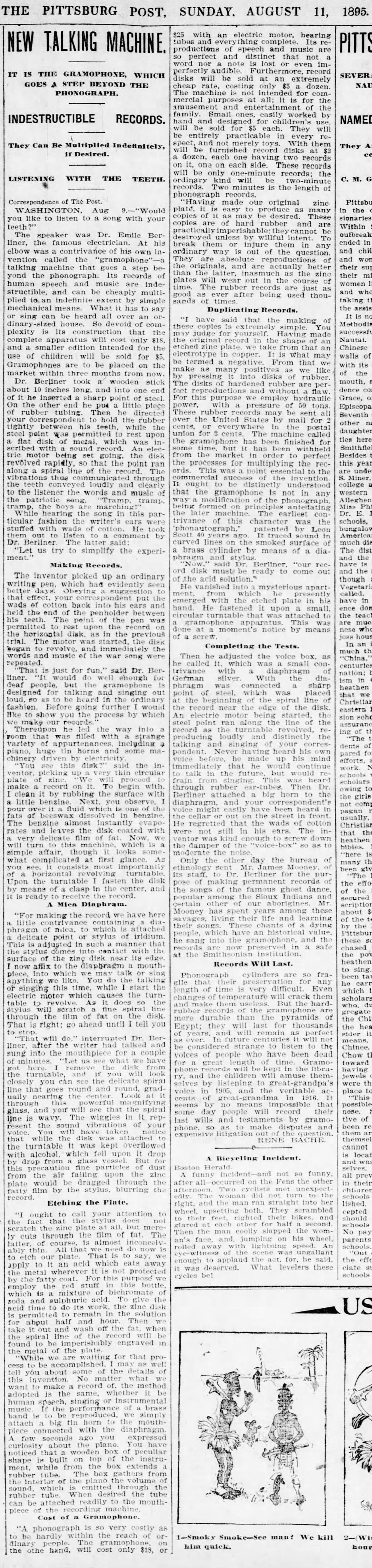 From the Pittsburgh Post, August 11, 1895 on Emile Berliner's new Gramophone.