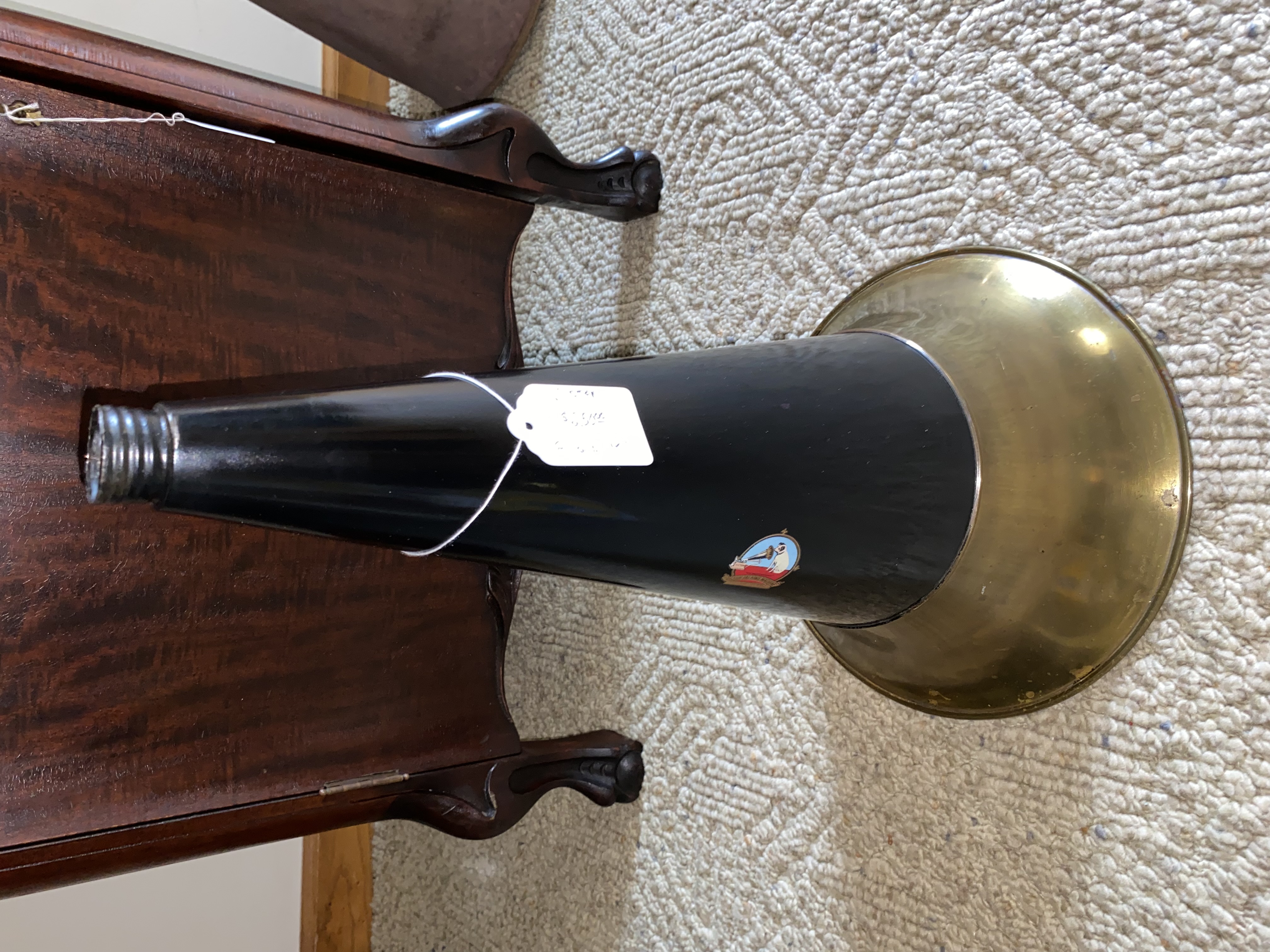 Hi all, I have an original 19" Victor horn with threaded end. The horn was rough when I got it. As it needed a paint job anyway I decided to use one of Greg Clines fabulous "early style" Victor decals with the placement appropriate for a rigid arm machine. Which is to say, the decal is on the "other side" of the horn, early blue background nipper decal. I confirmed placement on my rigid arm elbow and both the horn seam and decal line up as they should. WHICH MEANS it will not work well on a FM Victor machine, I have other horns to satisfy that demand. $250 plus shipping Please call, text, email or PM to purchase. Thank you! John Duffy 860-966-2827