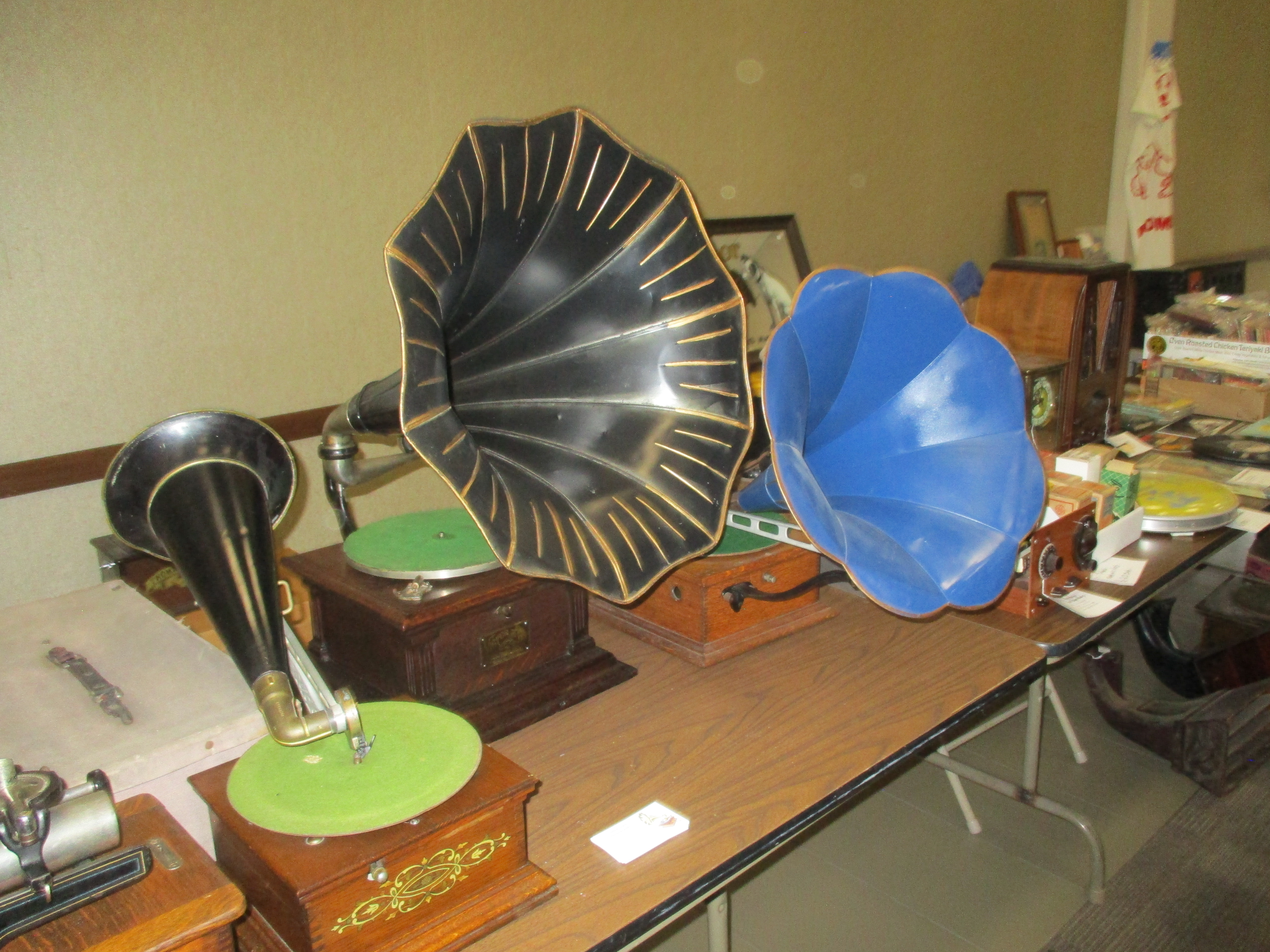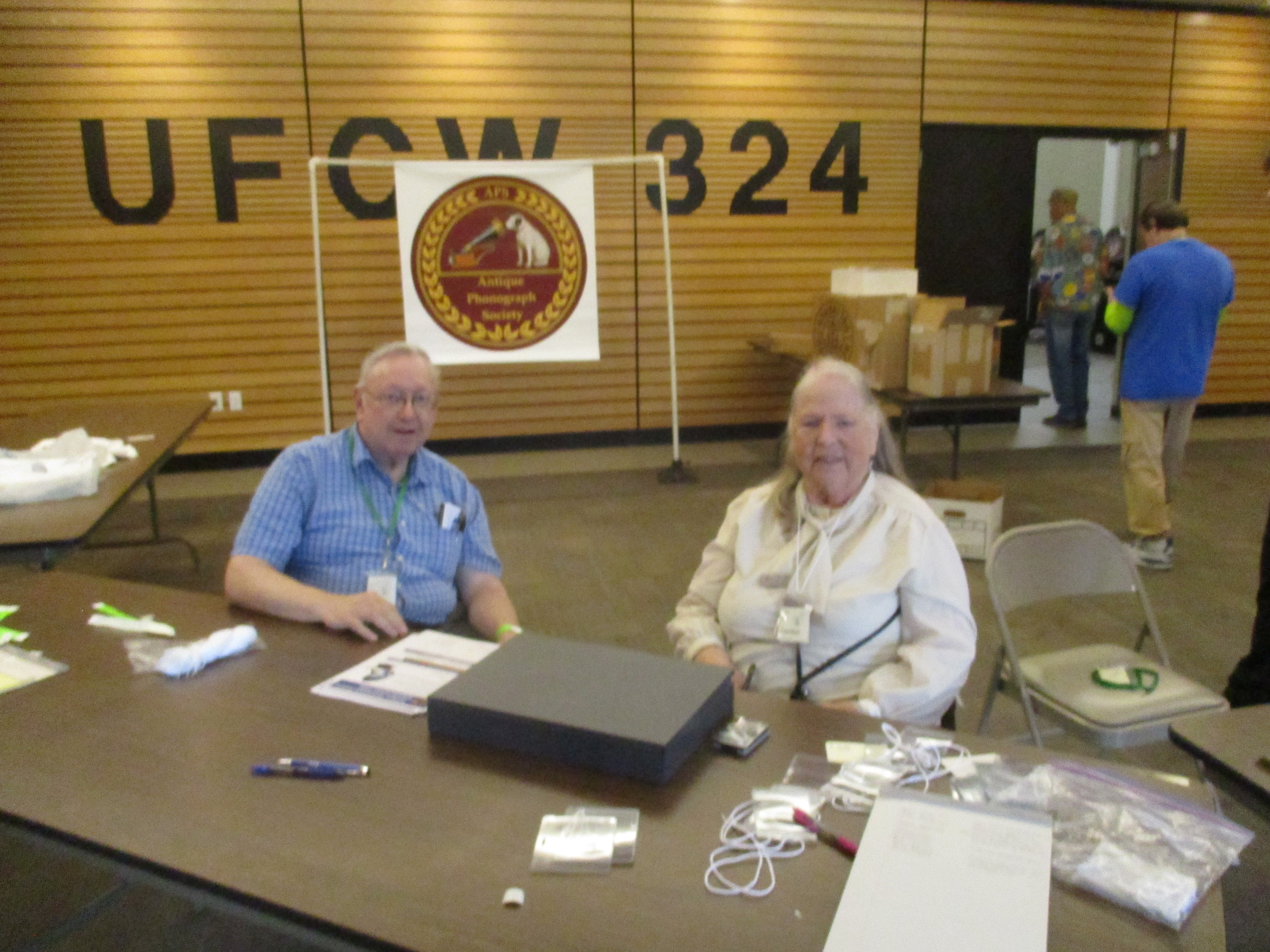 My wife and I had a nice time on Saturday morning at the show. She helped at the registration table. I sat for a photo with her after walking around and around and around looking for records and machines that were potential purchases. I ended up donating a cylinder machine to a young collector along with several reference books as an early birthday gift for him. All I bought were several records but I also renewed my APS Memberhip. Attached are a few photos and hopefully others will add to them.