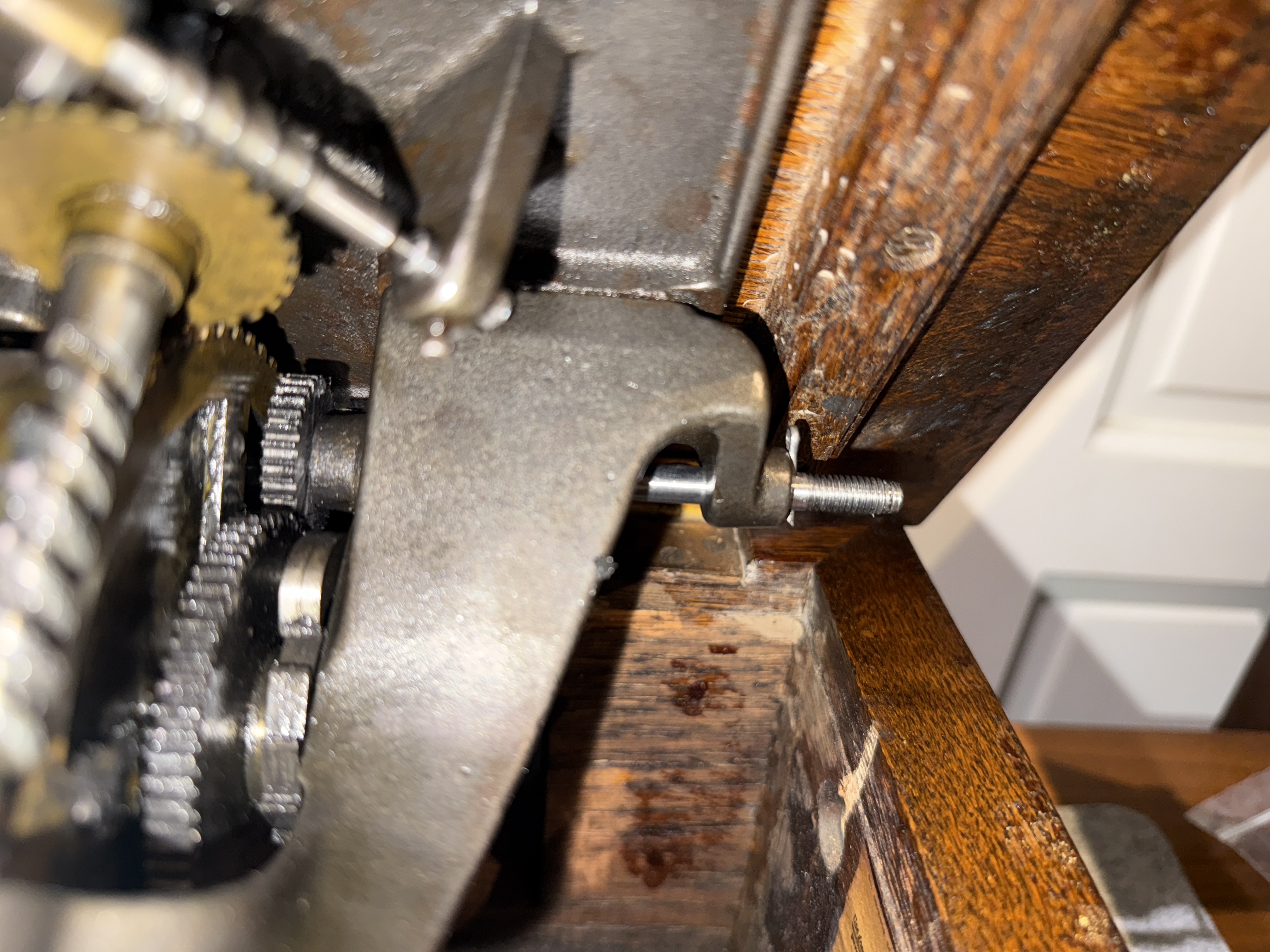 Once I made the right amount of threads on the end, I very carefully lined it up in the motor and marked where I wanted the hole for the pin and where the shaft needed to be cut for the winding gear to attach at the right length. There's not much room for error so take some time. The whole rod was just the slightest bit tight for the motor but I filed it down in the drill press a little bit and it worked (poor man's lathe - not really advisable and use at your own risk).