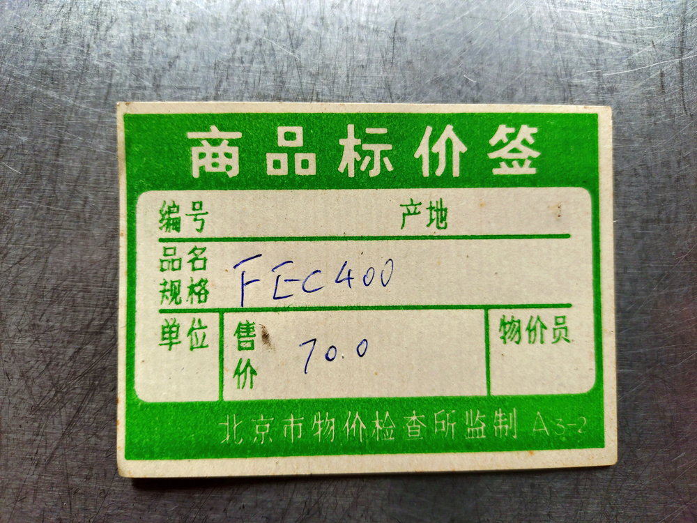 The price tag is a government issued price tag. What is odd is this is for a new electronic product, as the bottom text says Supervised by Beijing Municipal Price Inspection Office A3-2. My guess is this tag just slipped in or fell in the machine. Looks like 1970s-1980s. During the Great Leap Forward, offices inspected and regulated the price of newly produced products. This, along with the rest of the Great Leap Forward was a massive failure as it restricted the price of goods.