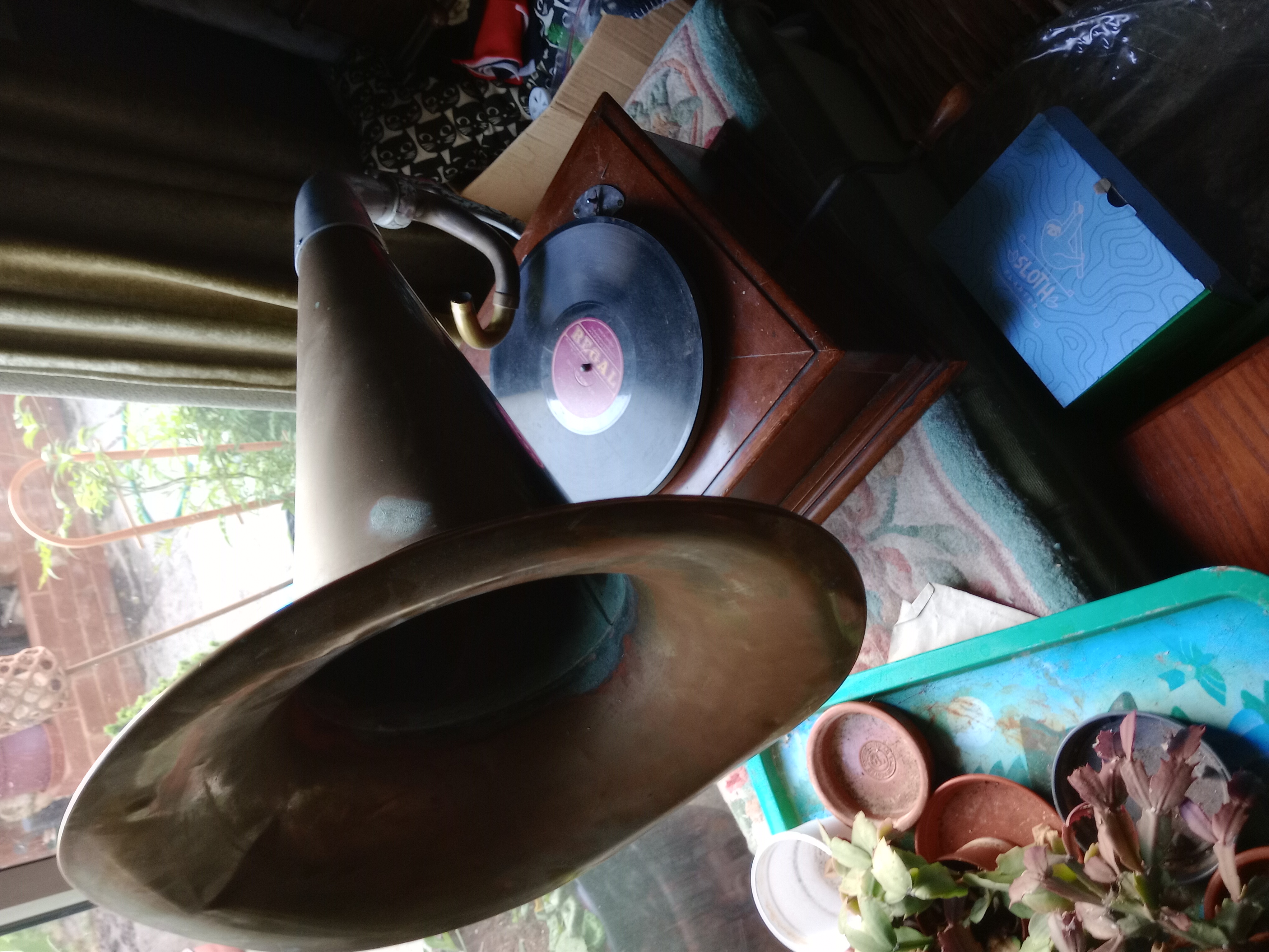 It started life as a Model 1 hornless (Type LBO); from the combination of the old-style (coarse tooth) motor and new-style quadrant speed control, I'd say about 1915. The upper parts are circa 1970-1980; the horn and aluminium elbow were being made about that time for just this sort of project, when the value of horn gramophones had reached a height that made repros worthwhile, and before the Bombay Specials flooded the market.