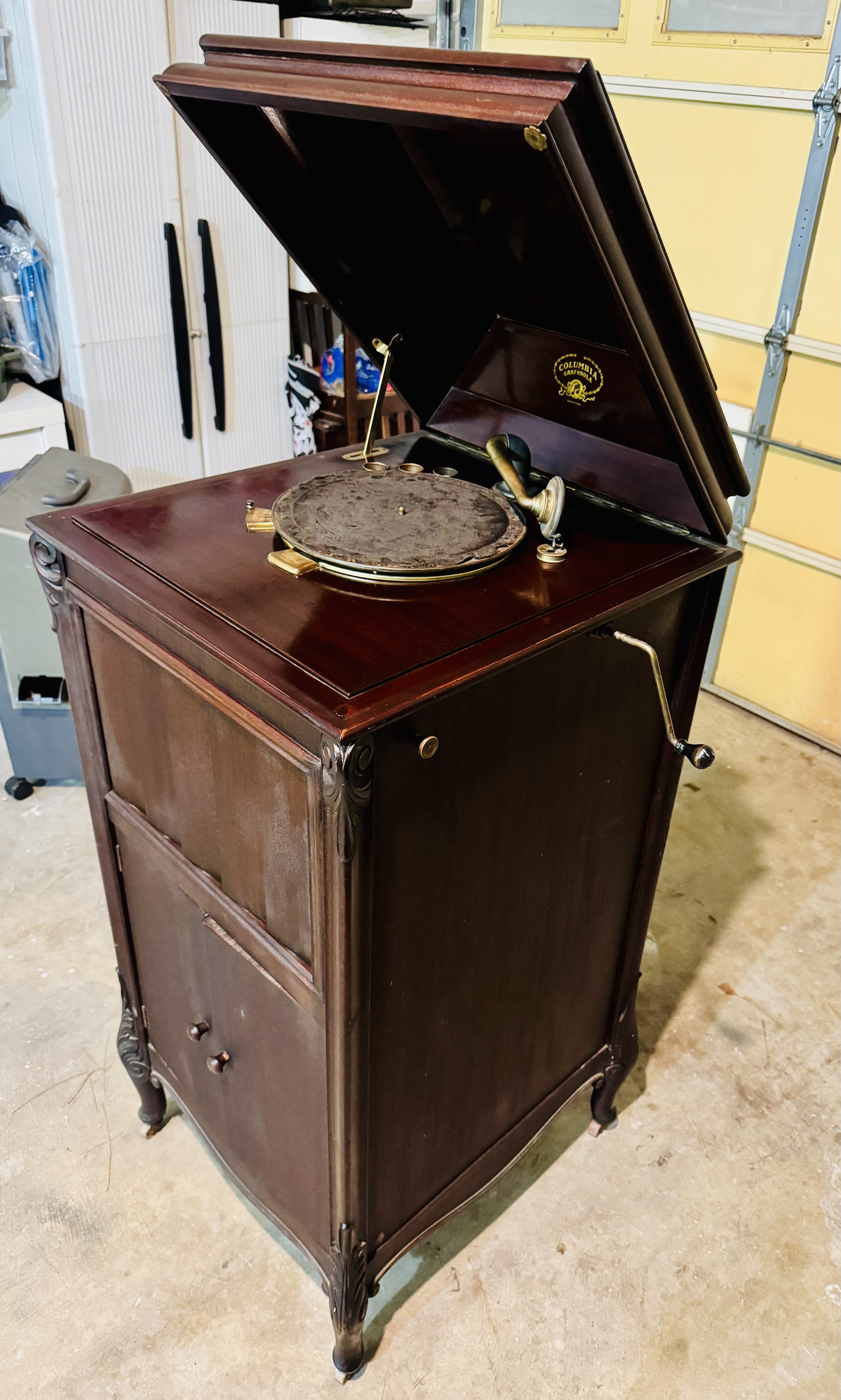 Hello everyone! I picked up this Grafonola at a Christian resale shop yesterday for $60. It’s in pretty good shape for being a wild find. I’m in the Houston area and the humidity wreaks havoc on phonographs. The finish has gatoring but very few scuffs although there are some wood gouges from it being moved improperly, nothing horrible though. The pot metal tone arm was very stiff but I did manage to take it apart and sand the joints so it moves freely, should I add some lubricant? Can anyone tell me what model it is? The reproducer is ugly and I’d like to find one that’s in cleaner condition. There’s a bunch of pitting on it and the gold finish is almost completely gone. The machine runs but I need to service it. The mainsprings sound dry.
