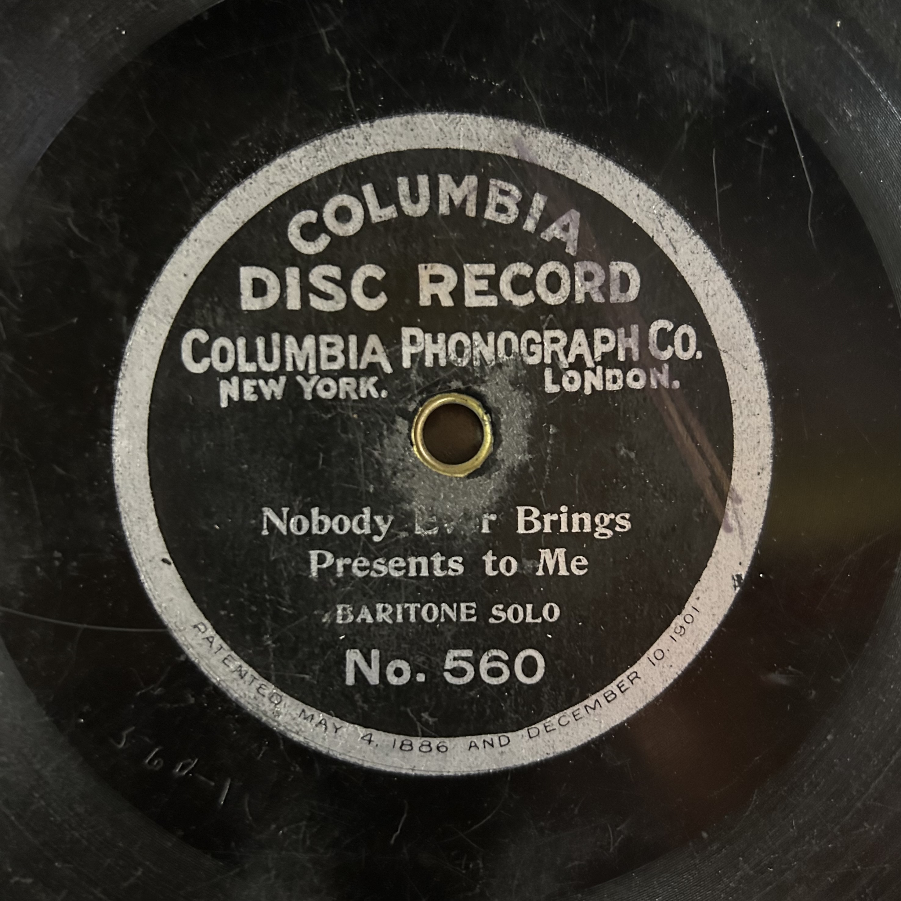 I found my record - 10” Columbia No.560, Nobody Ever Brings Presents To Me, which the DAHR says was recorded sometime between 1902 and 1905, though they list it as a 7-inch disc. Perhaps mine is a slightly later pressing? When were 7” discs phased out?