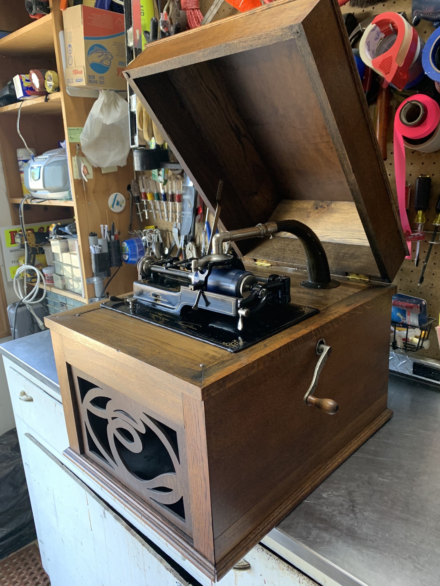 I've seen a couple of converted Edison outside-horn machines over the years (see photo of upright below) but all were converted Standards. I recently heard of a similarly converted Triumph and was able to purchase it. I love Triumphs, so why not!?!?!?