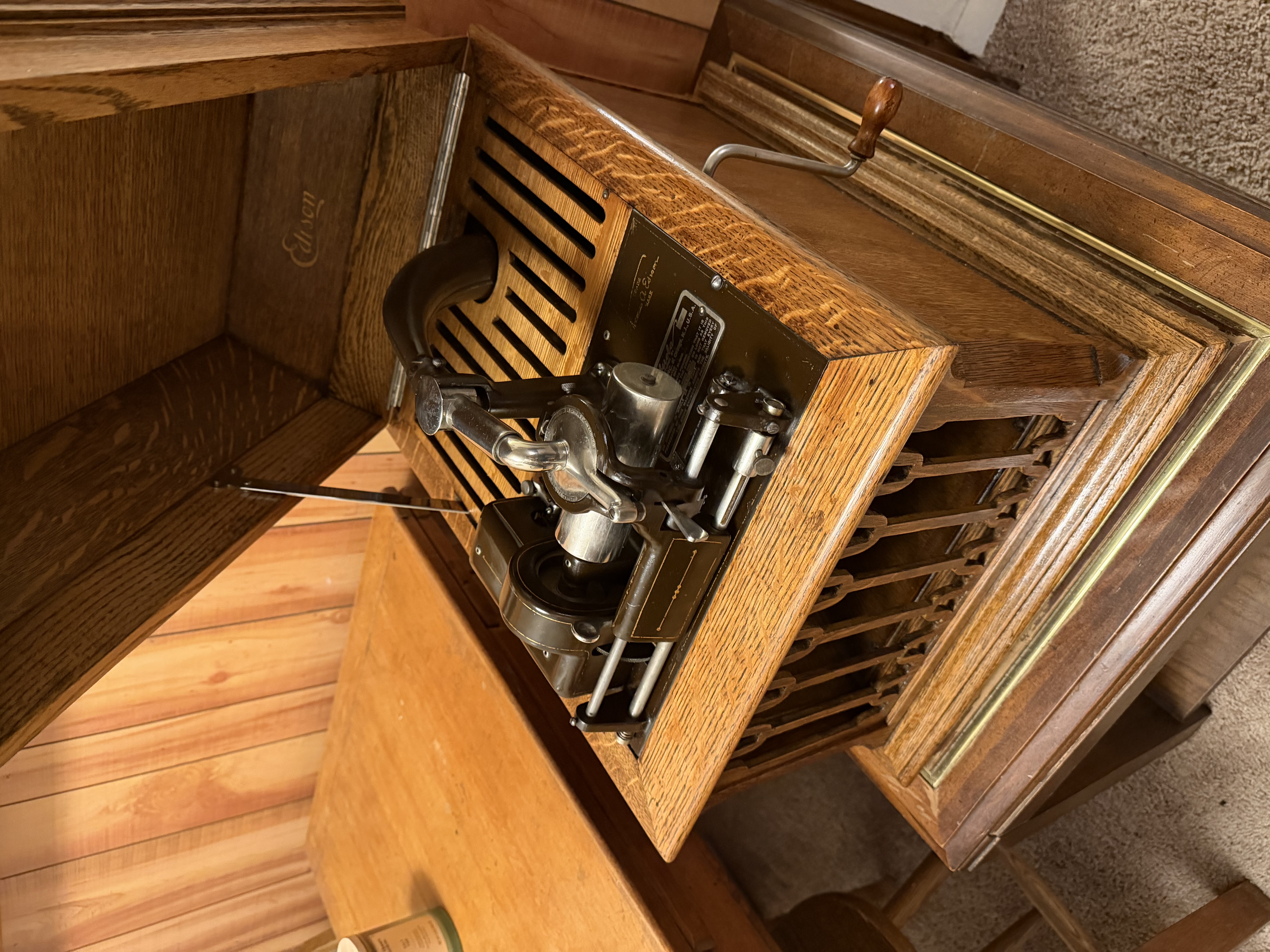 I recently purchased an oak Amberola V. Everything looked good in the eBay photos until I got a closer look at the finish. It appears someone had amalgamated the original shellac, but didn’t do too great of a job at it. (Uneven rough surface, patches of undissolved age-darkened shellac, etc.) Even the underside of the lid was redone, which from what I’ve seen, is something that usually never gets touched during a restoration. Judging by the how tacky/sticky it feels, it was probably recently done as well.