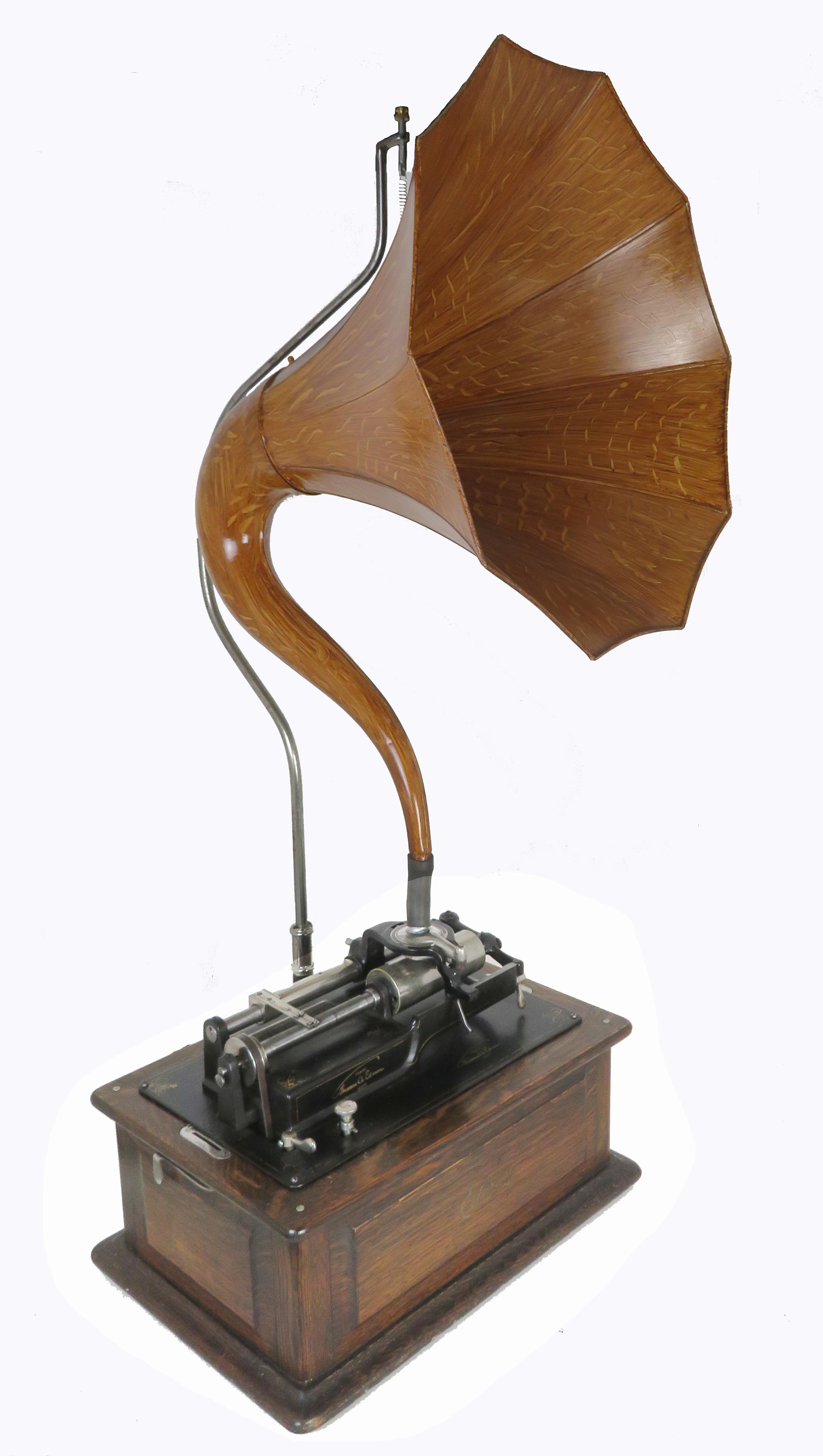 Offering an original Edison Cygnet 10 panel horn that has been given a new oak faux finish almost identical to original. This is not a reproduction horn but a well-cared for original. This is a great way to dress up your Edison cylinder phonograph display with a unique and beautiful horn. The photos showing the Edison Triumph are for display purposes only. This sale is only for the horn.
