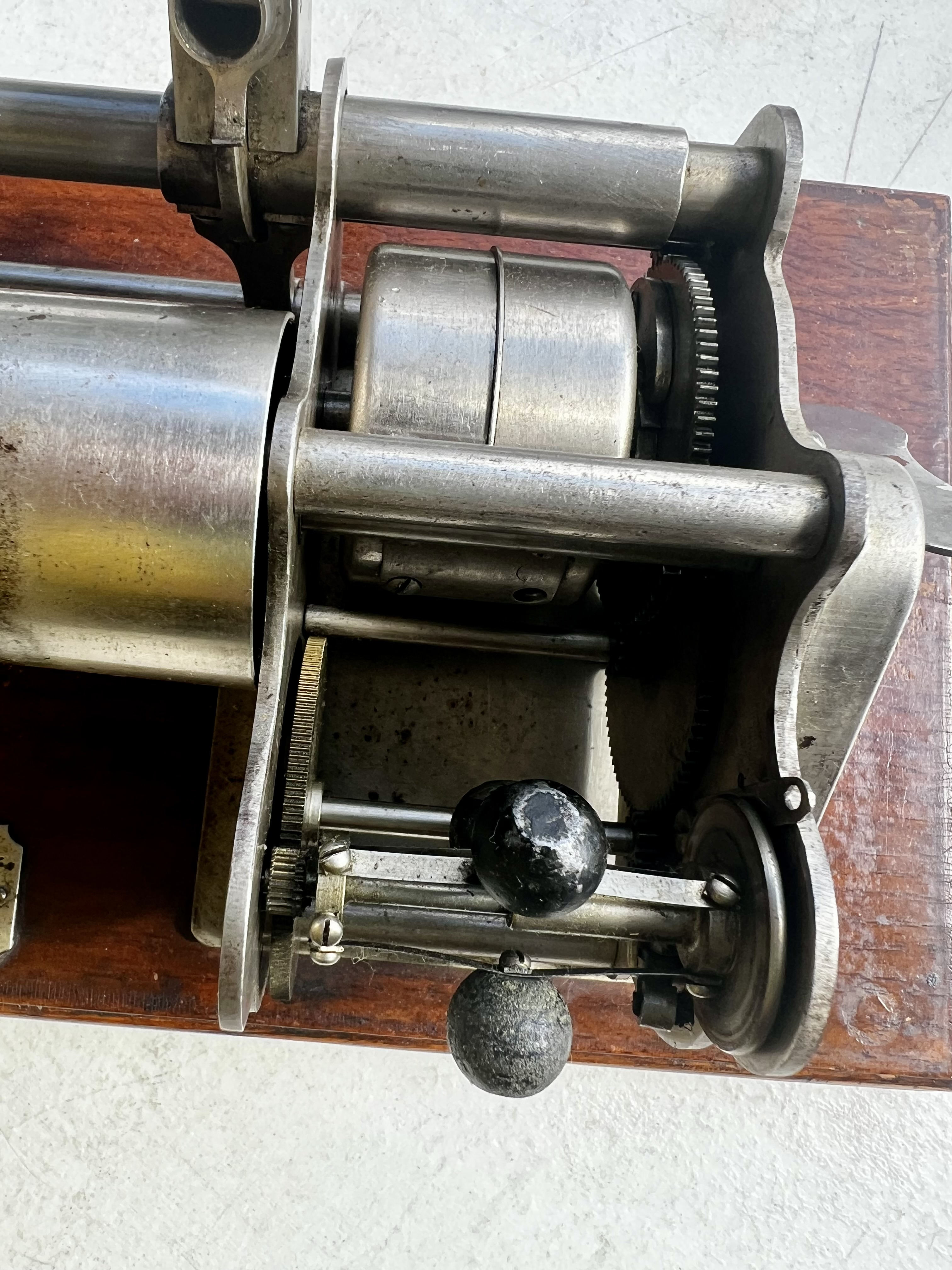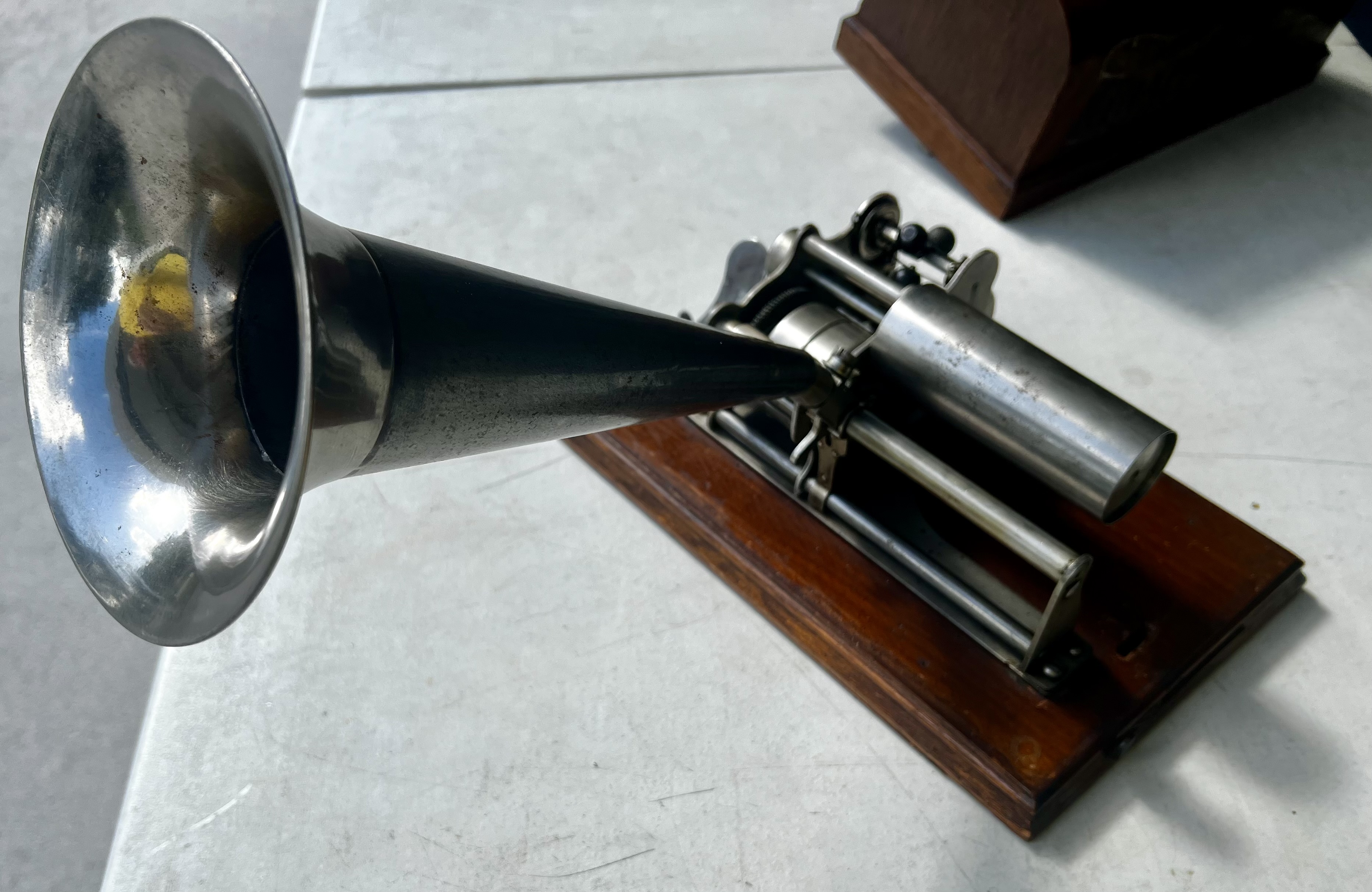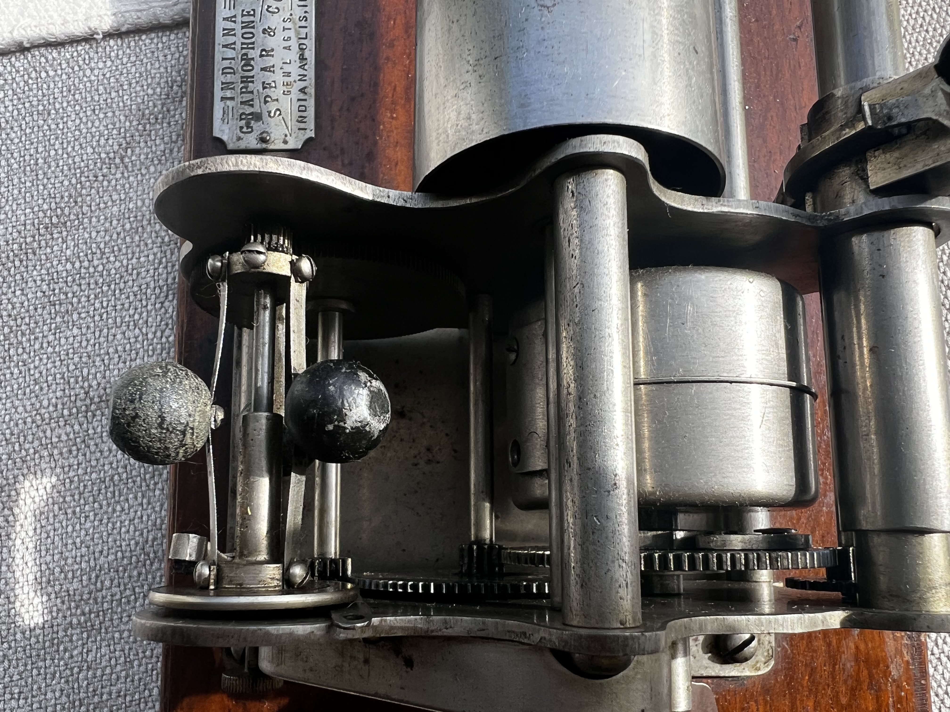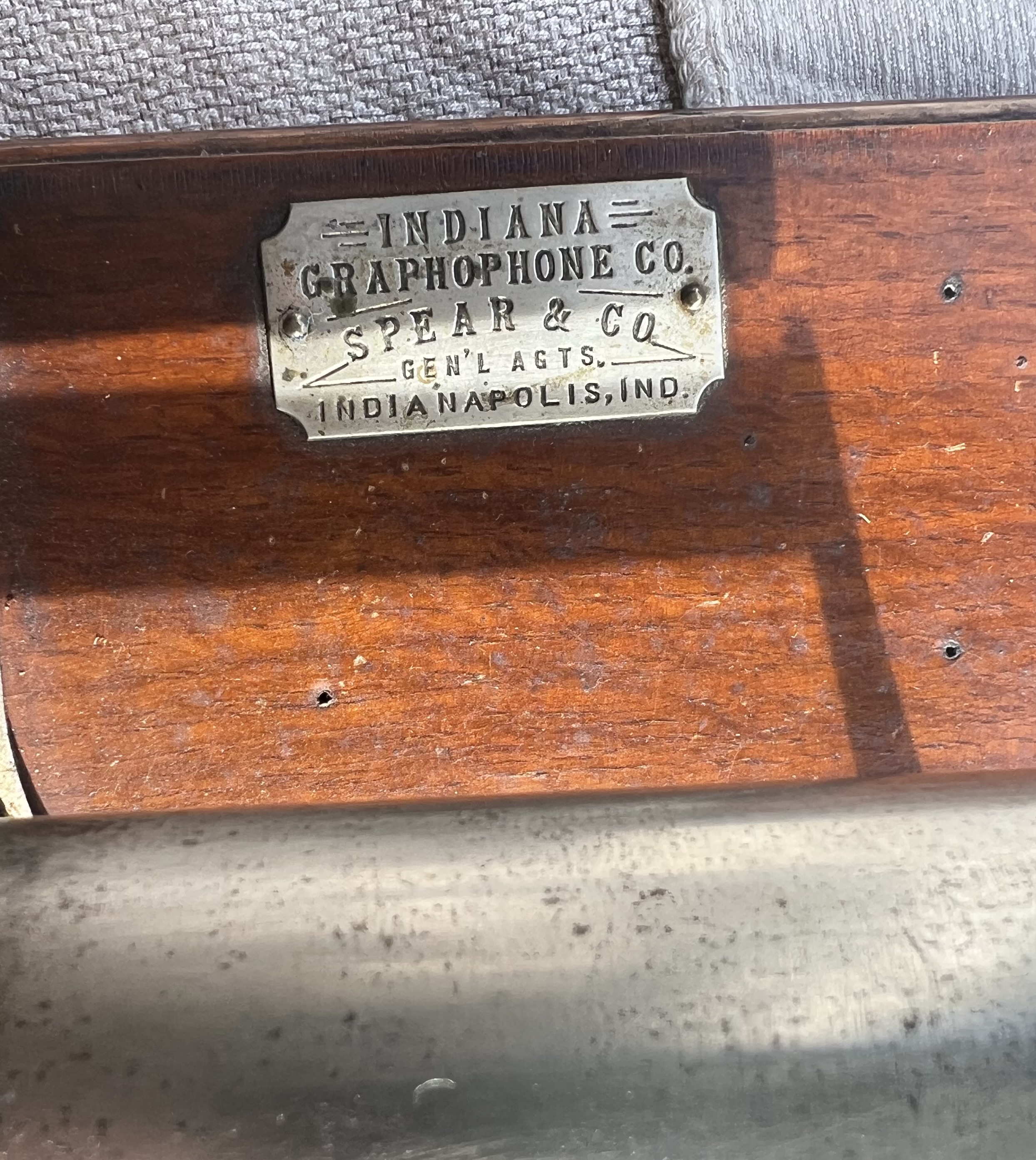 For all of you Columbia Eagle Type B Graphophone collectors, you’re going to like this, so read on. I’m offering for sale this variation from the Indiana Graphophone Company, Spear & Company General Agents, Indianapolis. This example is serial number 81853 ink stamped on the bottom of the base. As can be seen it’s done a lot of entertaining over the last 125 years and shows signs of typical wear. I chose not to clean it up, this is how I purchased it. It could be disassembled and each part cleaned up but that will be the next owners choice. I oiled it up a little and it’s been running smooth since. It easily plays through a cylinder without excessive thumping and slipping. I’ve added an original 10” nickel horn and will offer the option of not purchasing the horn if you have one you would rather use. This horn is missing most of its plating on the steel body while the brass horn bell has retained most of its nickel and presents nicely with only minor dents. It also has the proper crooked end used on Eagles. If you have questions or photo requests or want to commit to buy please PM me. Preferred payment is check, money order or Zelle. PM me for alternative methods. Price as seen with the horn is $1100. I’ll credit $300 if you don’t want the horn. Thanks for looking.