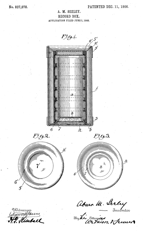 December 11, 1906: Abner Seeley received a U.S. patent (No.837,970) on a “Record Box.” This was the familiar container with indented bottoms and lids which housed Edison Gold-Moulded Records.