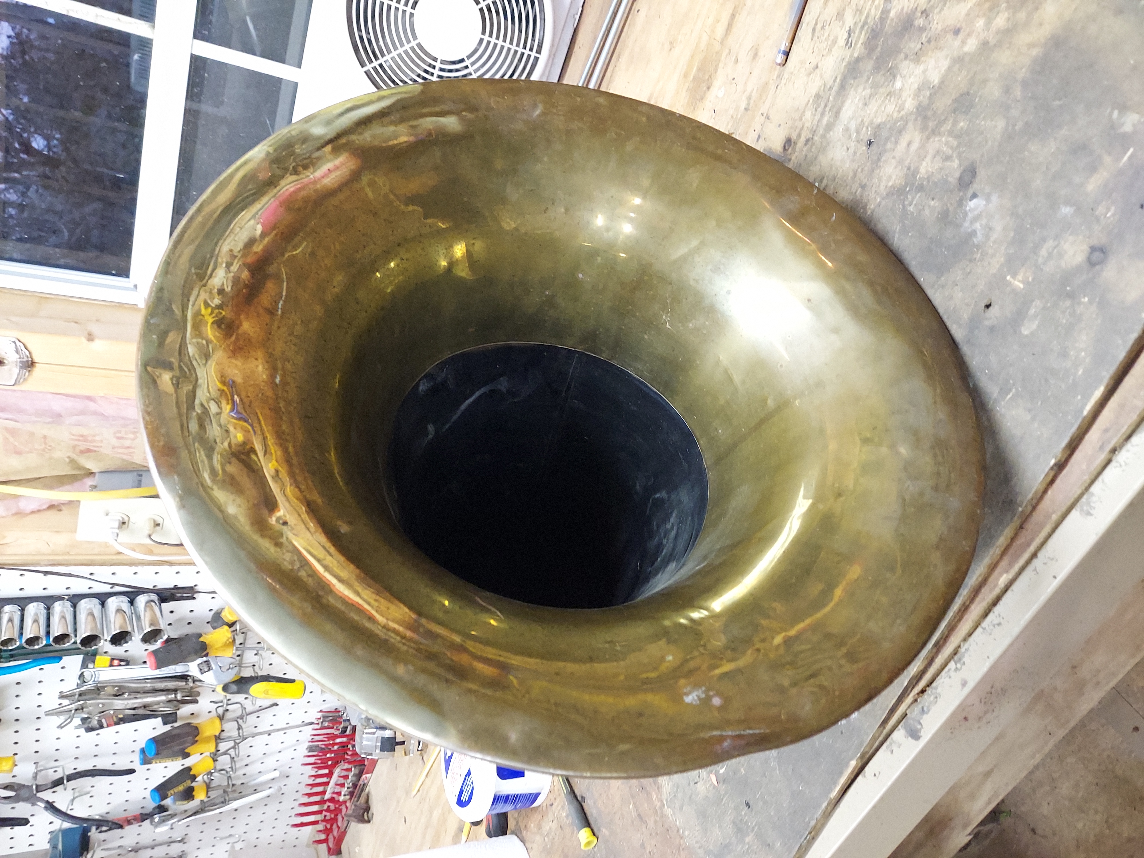 This horn appears to have been a 30-inch all-brass horn for a cylinder machine. Check the outside body of the horn opposite the seam for signs of a hanger. Of course, if it was a soldered hanger, there will probably be no trace of it.