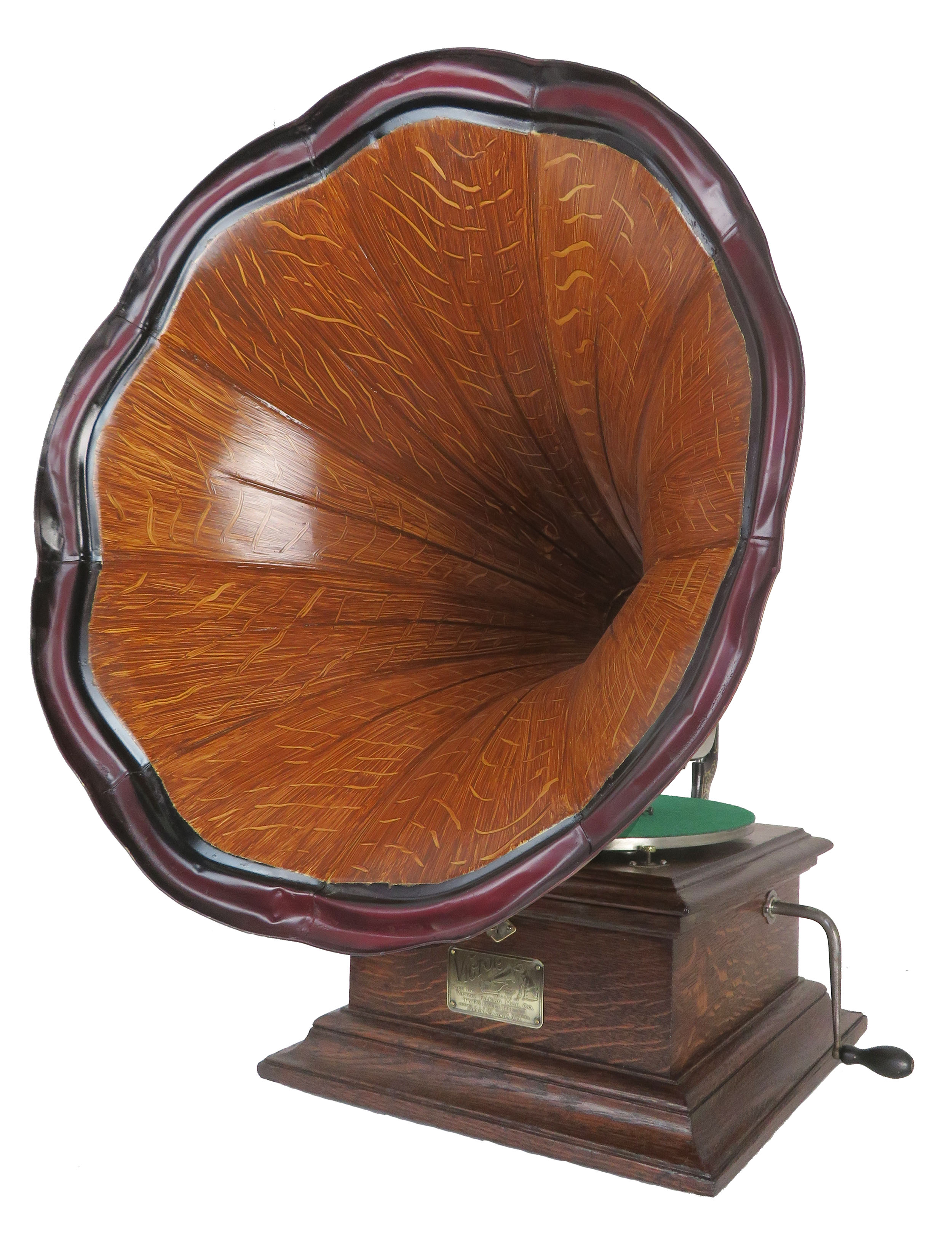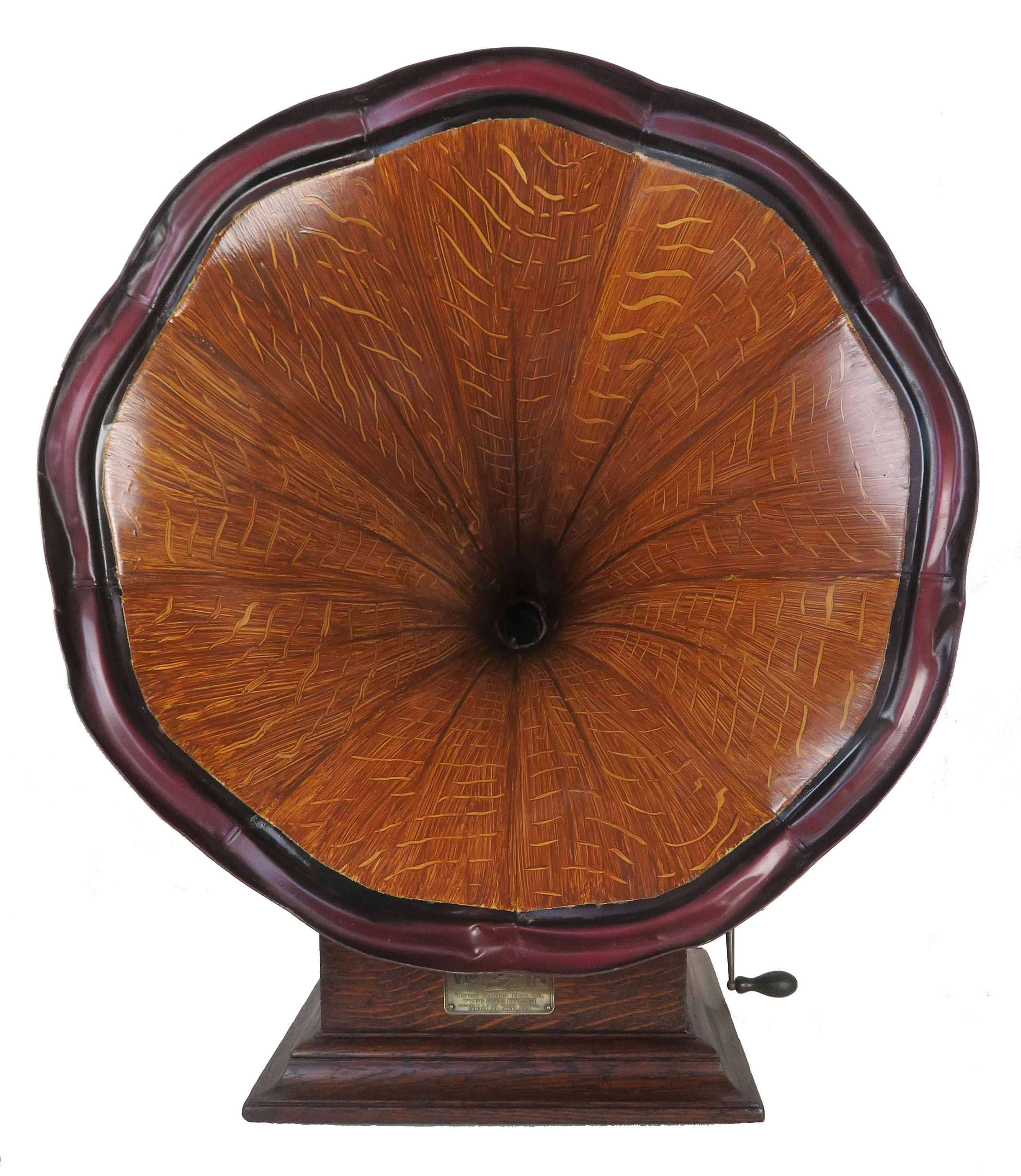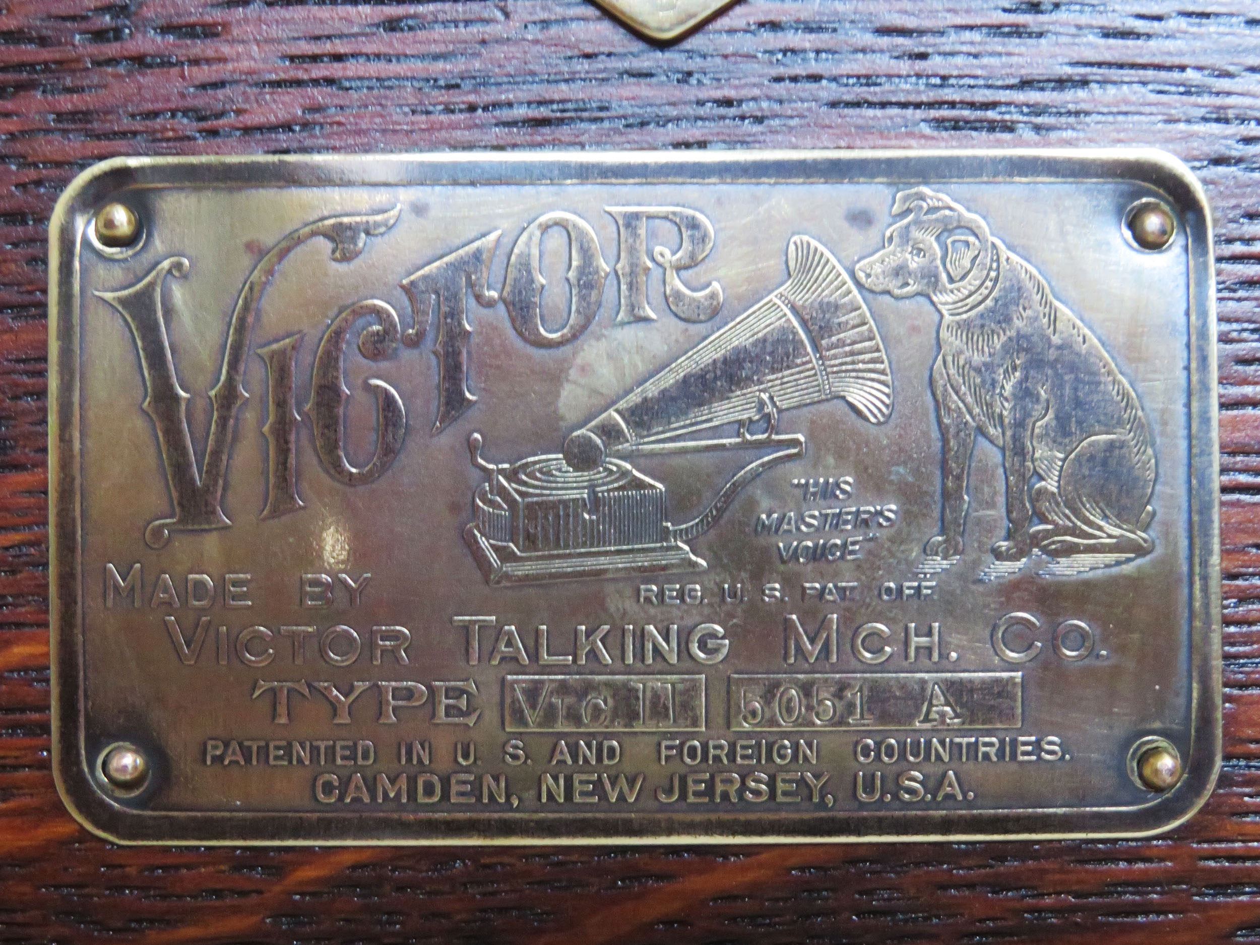 Offering a late model Victor II, Serial No. 5051A which has been restored. The phonograph is equipped with a scalloped European style horn which has an oak grained faux finish. The horn measures 19.5” wide x 22” long. A nut and flat-head bolt is used to secure it to the Victor elbow since the horn does not have the button. The motor has been serviced and runs quietly. The reproducer has been rebuilt and plays loud and clear.