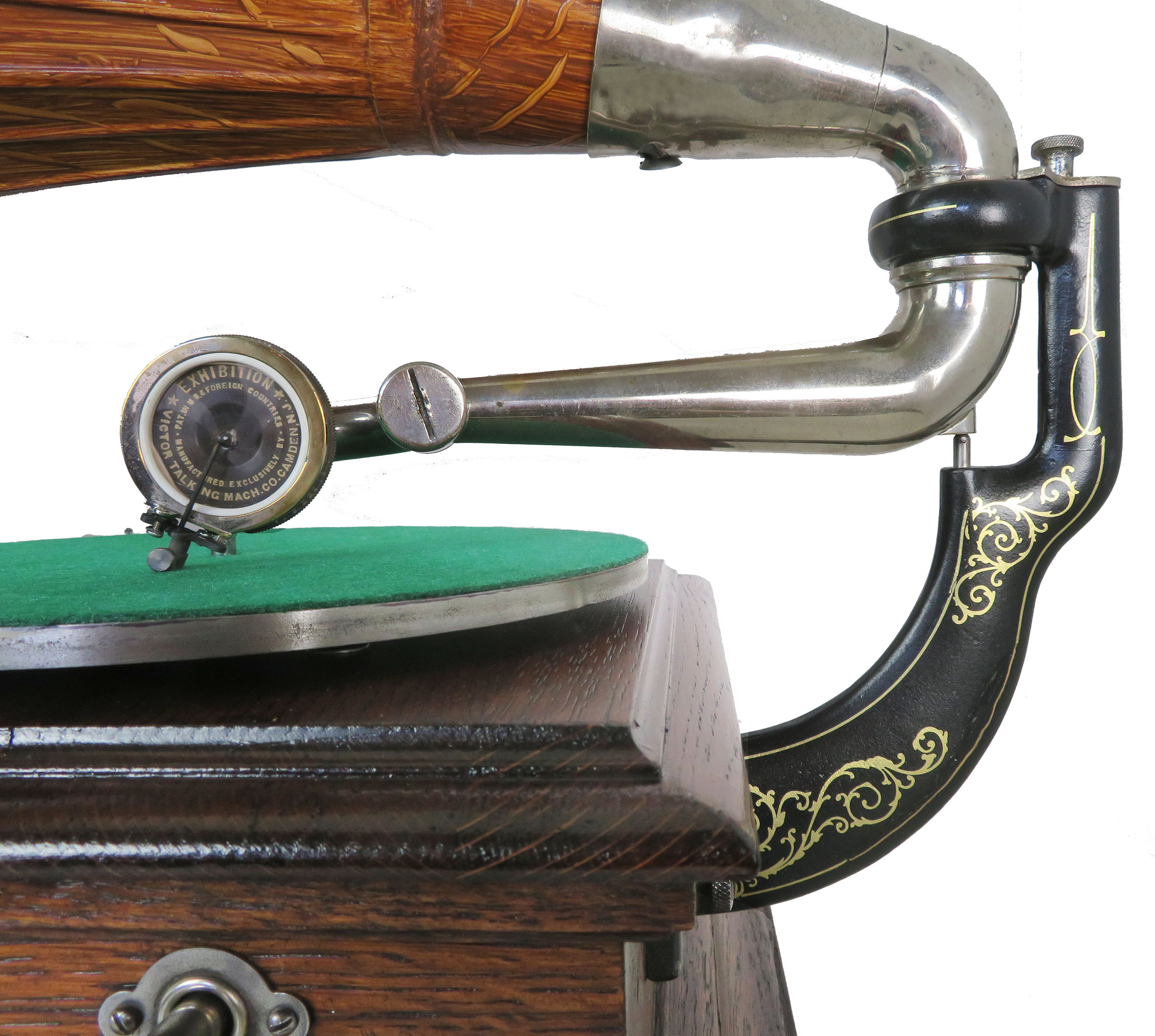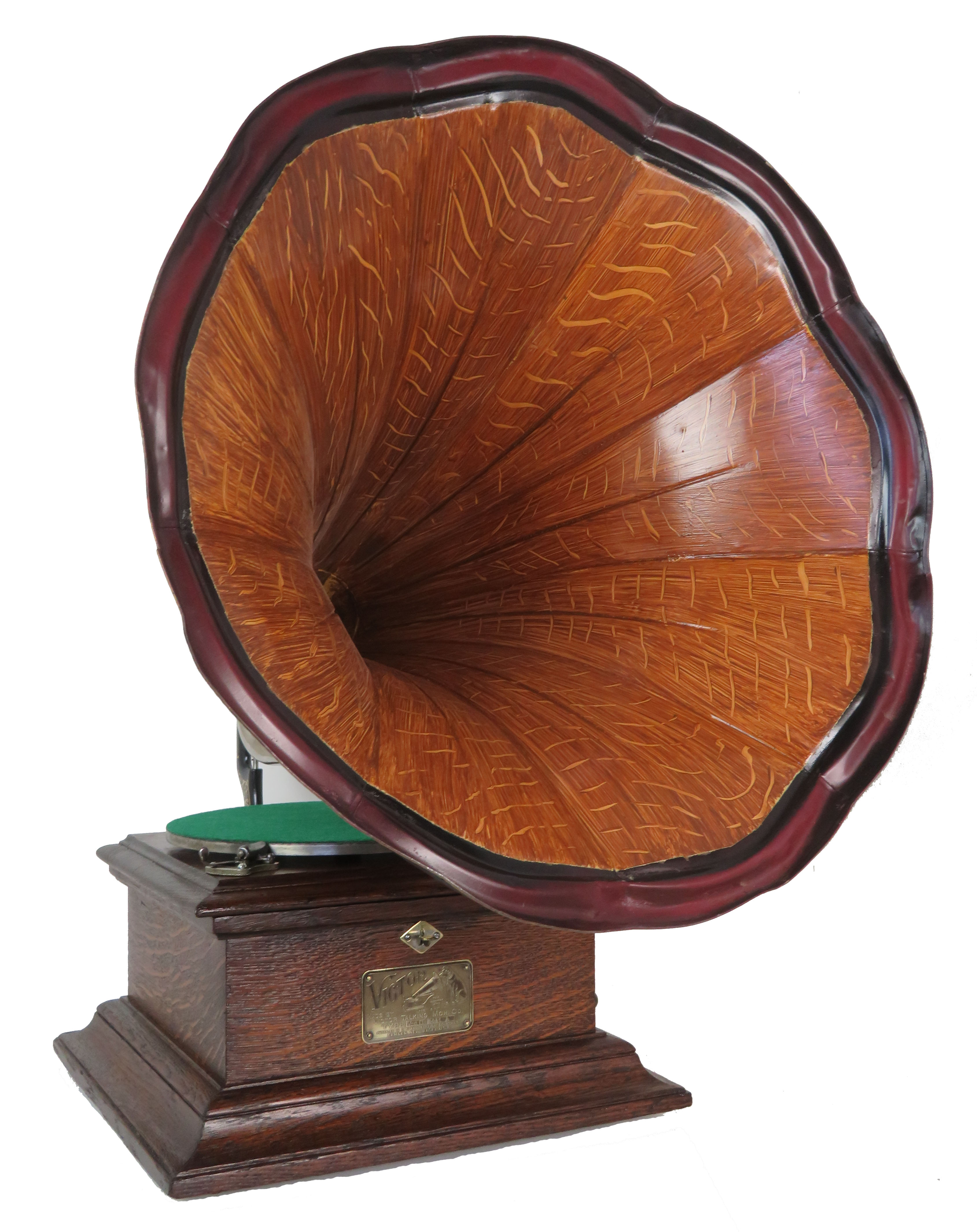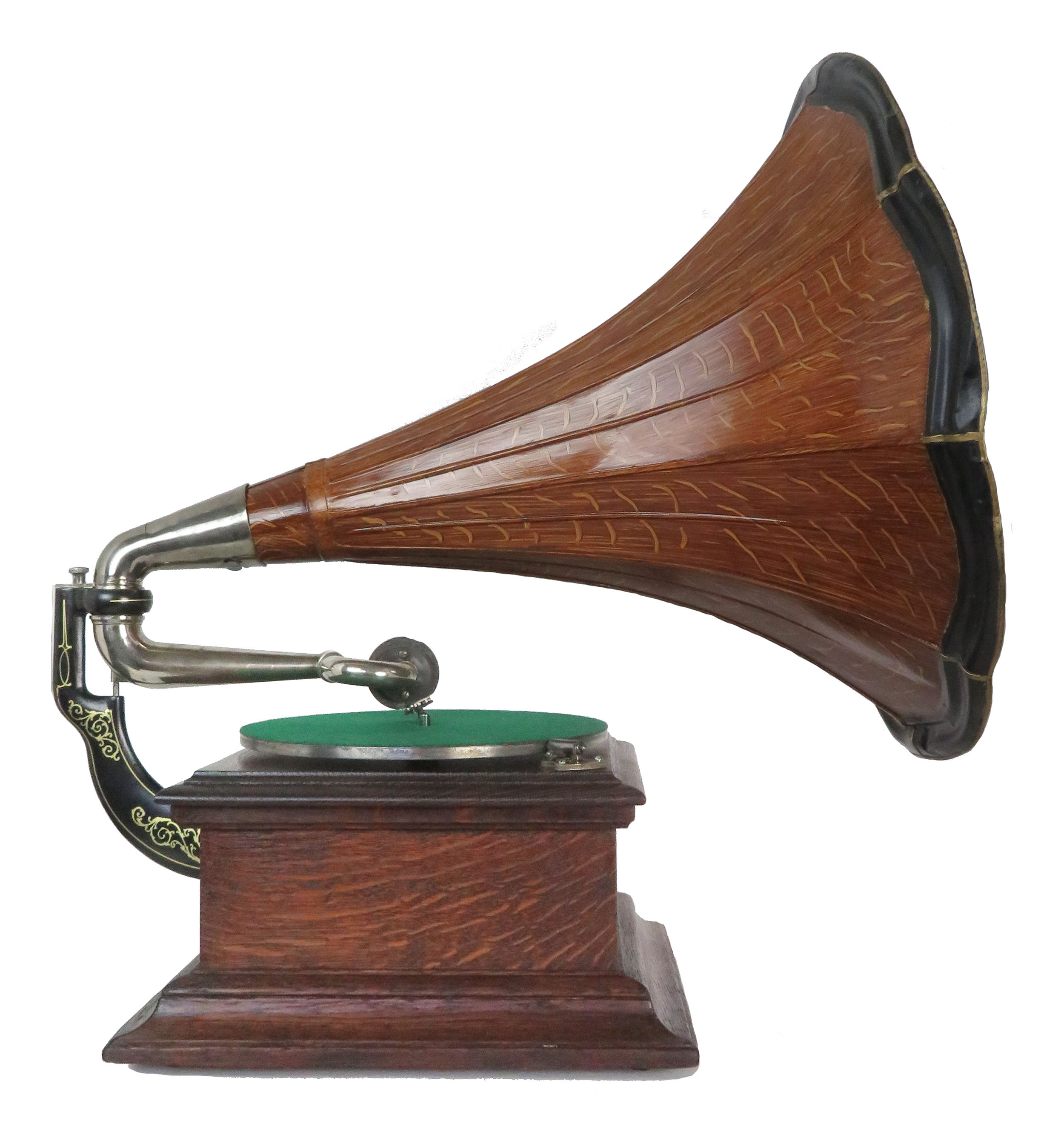 Offering a late model Victor II, Serial No. 5051A which has been restored. The phonograph is equipped with a scalloped European style horn which has an oak grained faux finish. The horn measures 19.5” wide x 22” long. A nut and flat-head bolt is used to secure it to the Victor elbow since the horn does not have the button. The motor has been serviced and runs quietly. The reproducer has been rebuilt and plays loud and clear.