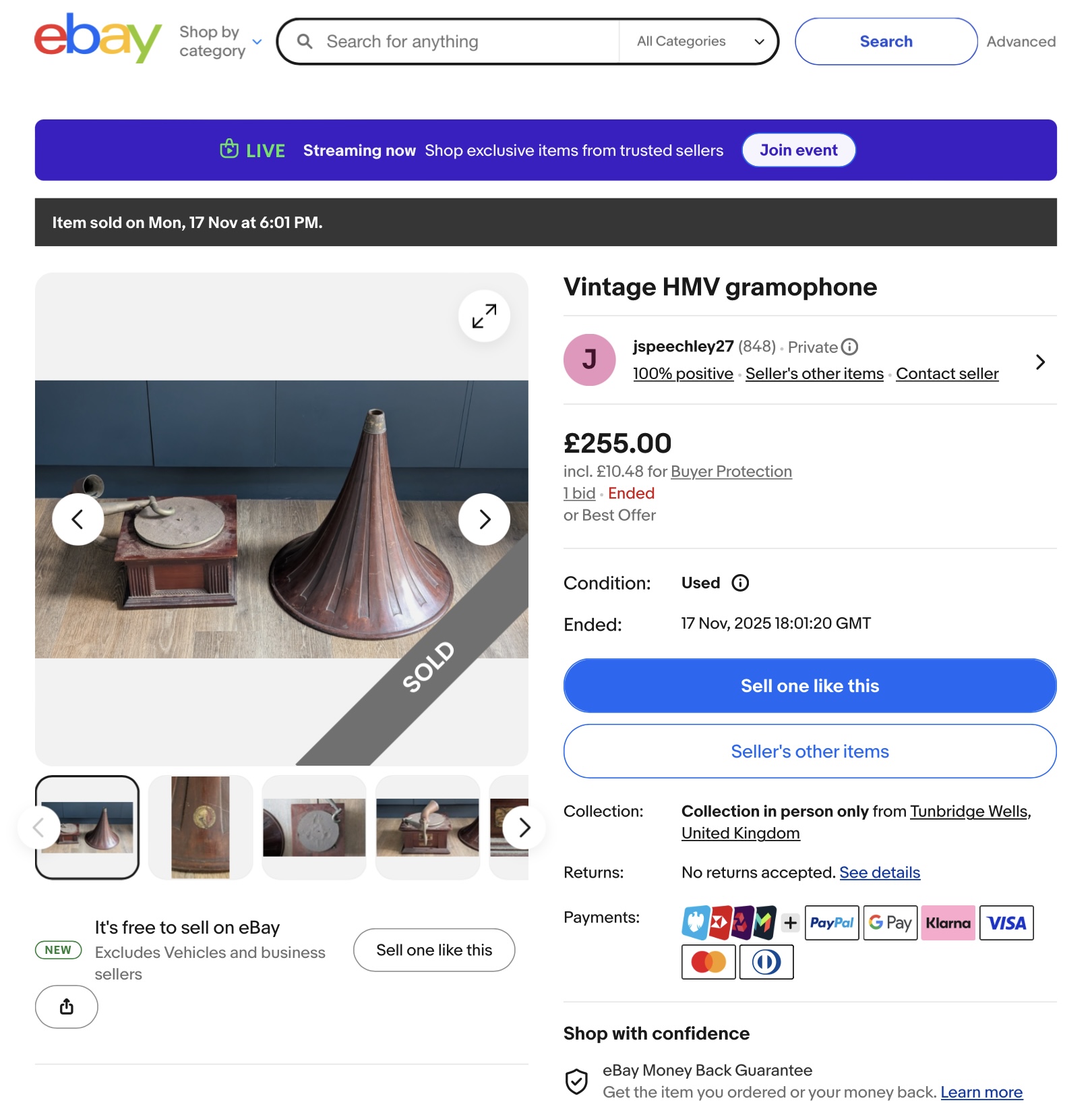jamiegramo wrote: Thu Nov 20, 2025 12:36 pm Speaking of bargains this nice looking mahogany horned Monarch gramophone just sold for £255. Or was it even less? Clicking on ‘bid’ it appears the only bid amount was £50 and listed for just a day. Did the seller accept an offer and end the listing early? Why are some sellers so impatient? I would have paid 3 times X £255 for the horn alone.