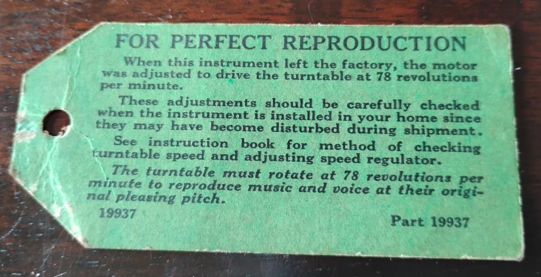 An original tag from the machine. It was stuck down at the bottom of the record holder. It has the price and serial number written on the back: