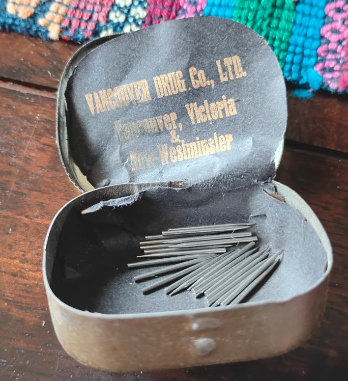 Two custom badged needle tins (with lots of new needles, not original ones, though). These tins are cool because they are local, branded for a then local drug store. The needles and tins claim to be made in Barvaria.