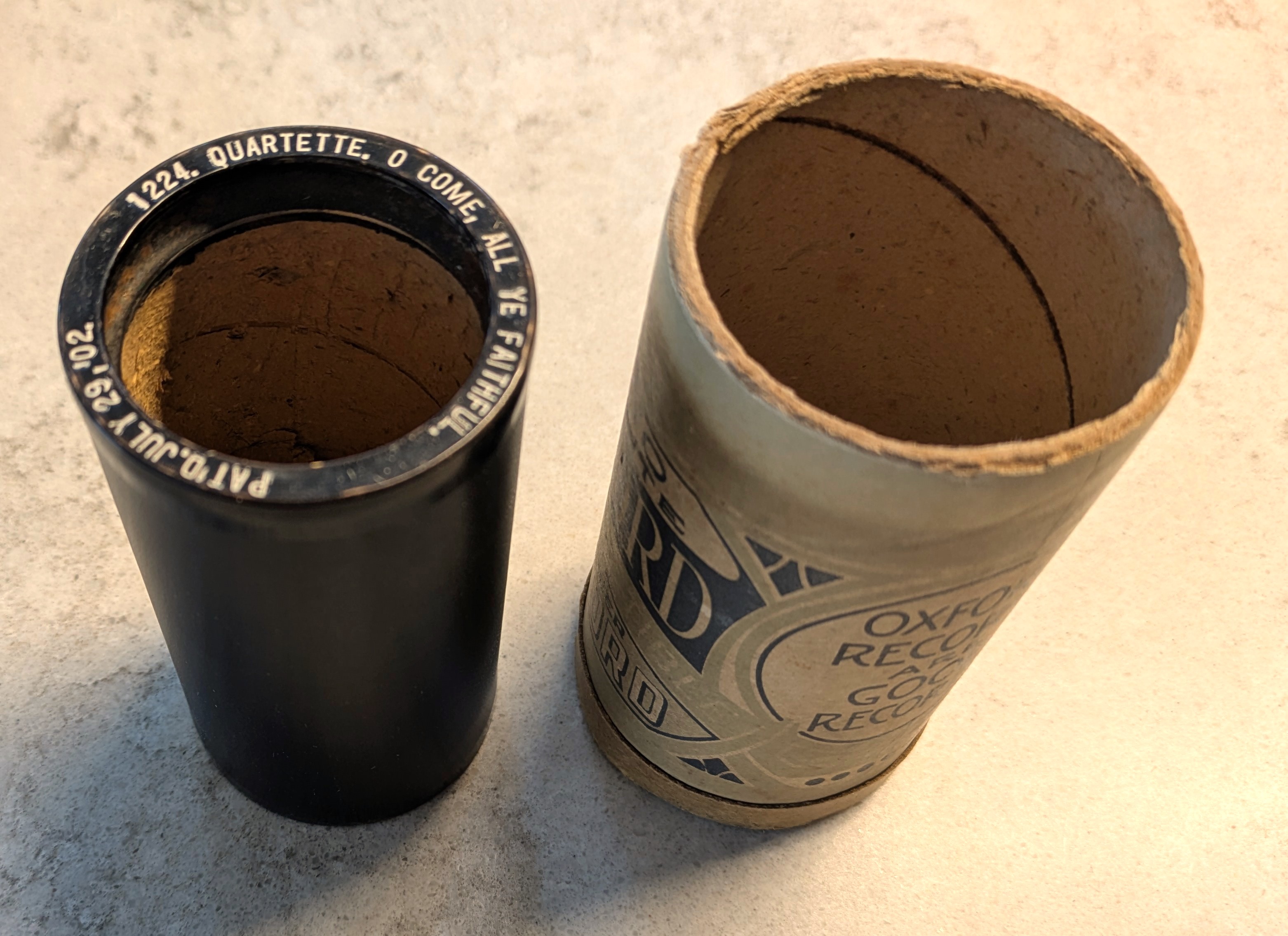The Final cylinder is an original Indestructible cylinder of Oh Come All Ye Faithful – 1224. It has a shiny surface and plays very well. The inside cardboard is flaking, but it fits well on a mandrel. An outstanding playing copy. The record can be played on any 2-minute phonograph.