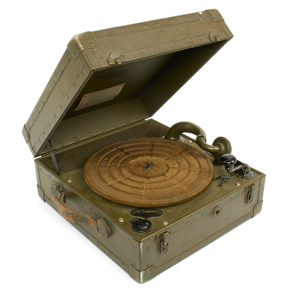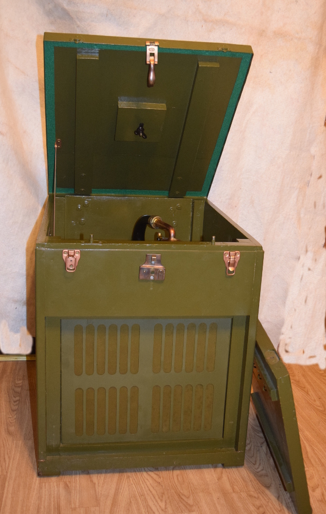 I have a Army portable phonograph that I was planning on eventually restoring but I don't have any time right now. If you are interested I could look for it and take some pictures. Its in rough shape on the outside but it plays great. I didn't have a tonearm so I used one from a Silverstone and I don't have the original crank. It looks just like this one but it needs to have the veneer replaced on the top.