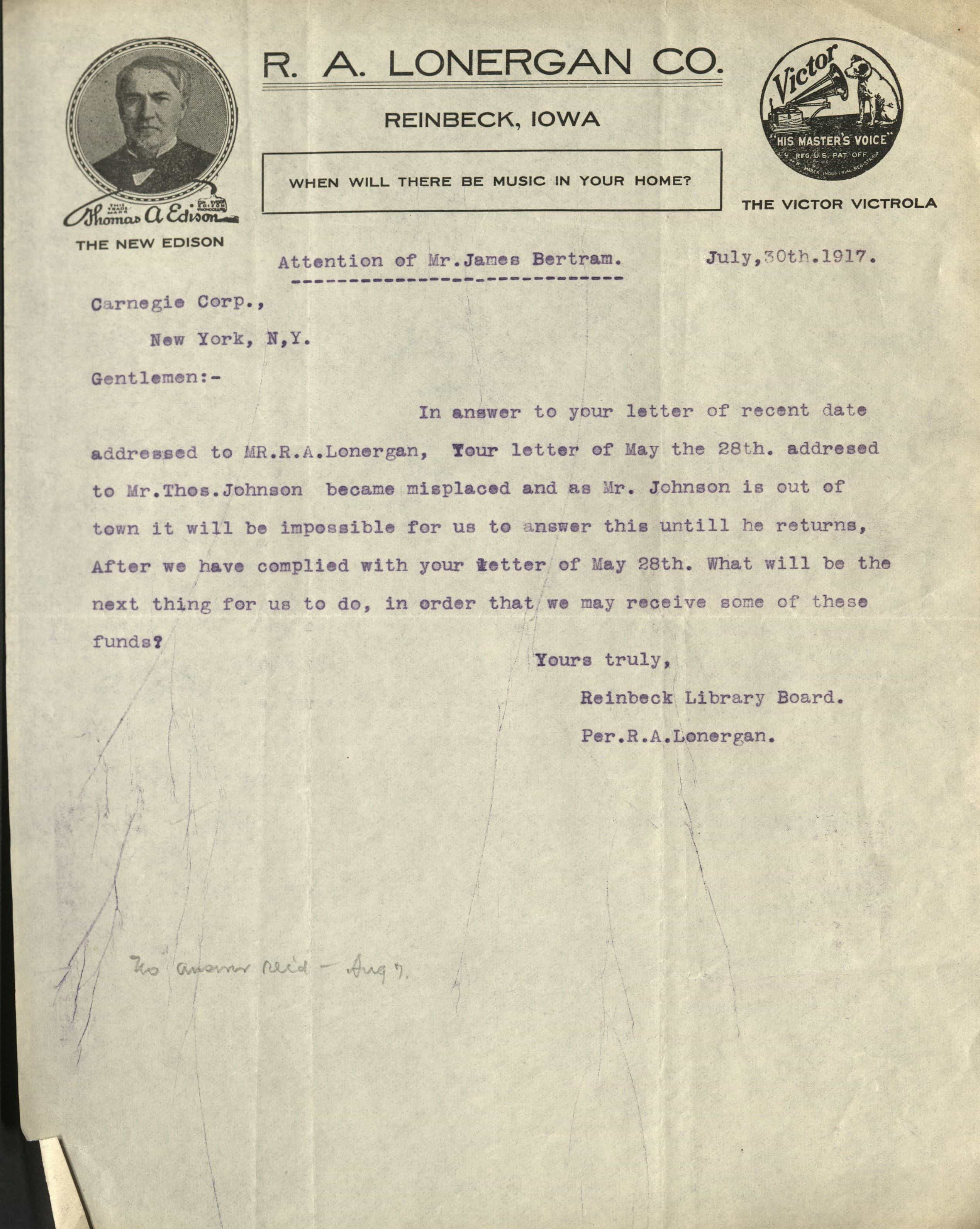 My Grandfather (Robert A Lonergon) - sold RCA phonographs in Reinbeck, Iowa. He was a pharmacist at Rexcall Lonergan Drug Store. He sold the phonographs from the attic of an adjoining bldg to his pharmacy, He won a trip to Chicago (with his wfe Anna Lonergon) for being the high seller of phonographs. Robert & Anna met Thomas Edison & had their picture taken with him. I believed it was around 1915. Do you have any info on Robert A Lonergan a sales representatve for RCA phonographs? Possibly you may have seen the picture I am searching for. Please advise if you know anything about Robert A Lonergan. Thank you! Kim