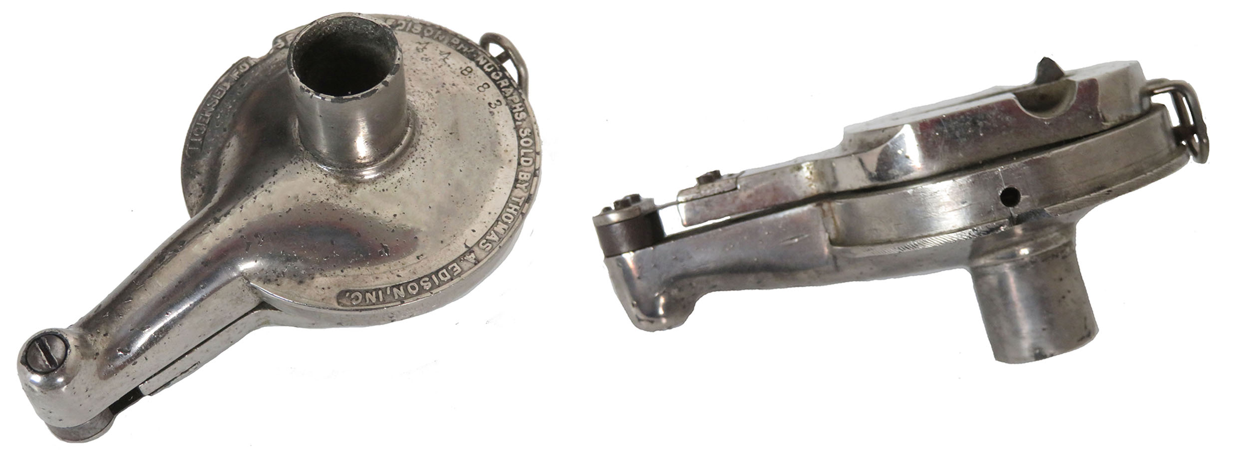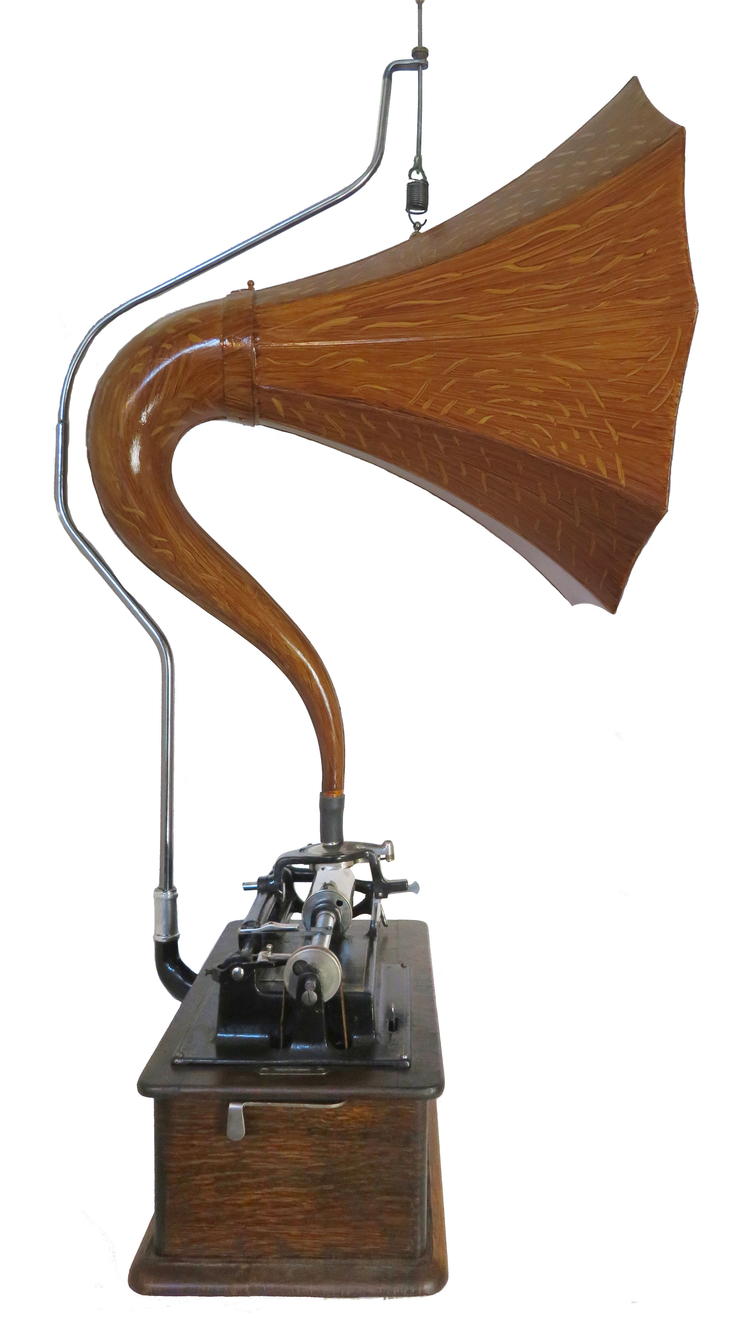 Offering an all-original Edison 2/4 minute Home cylinder phonograph with a 10-panel Cygnet horn that has been given an oak faux finish almost identical to original. This is not a reproduction horn but a well-cared for original. The Home serial number is 302820. The phonograph has been restored, lubricated and adjusted for reliable operation. The crane is a quality reproduction custom outfitted for this phonograph. The B reproducer plays loud and clear. It can be used to play 4-min blue Amberola records or 2-minute indestructible cylinders. You cannot play brown or black wax cylinders with a B-reproducer. The case decal is reproduction.