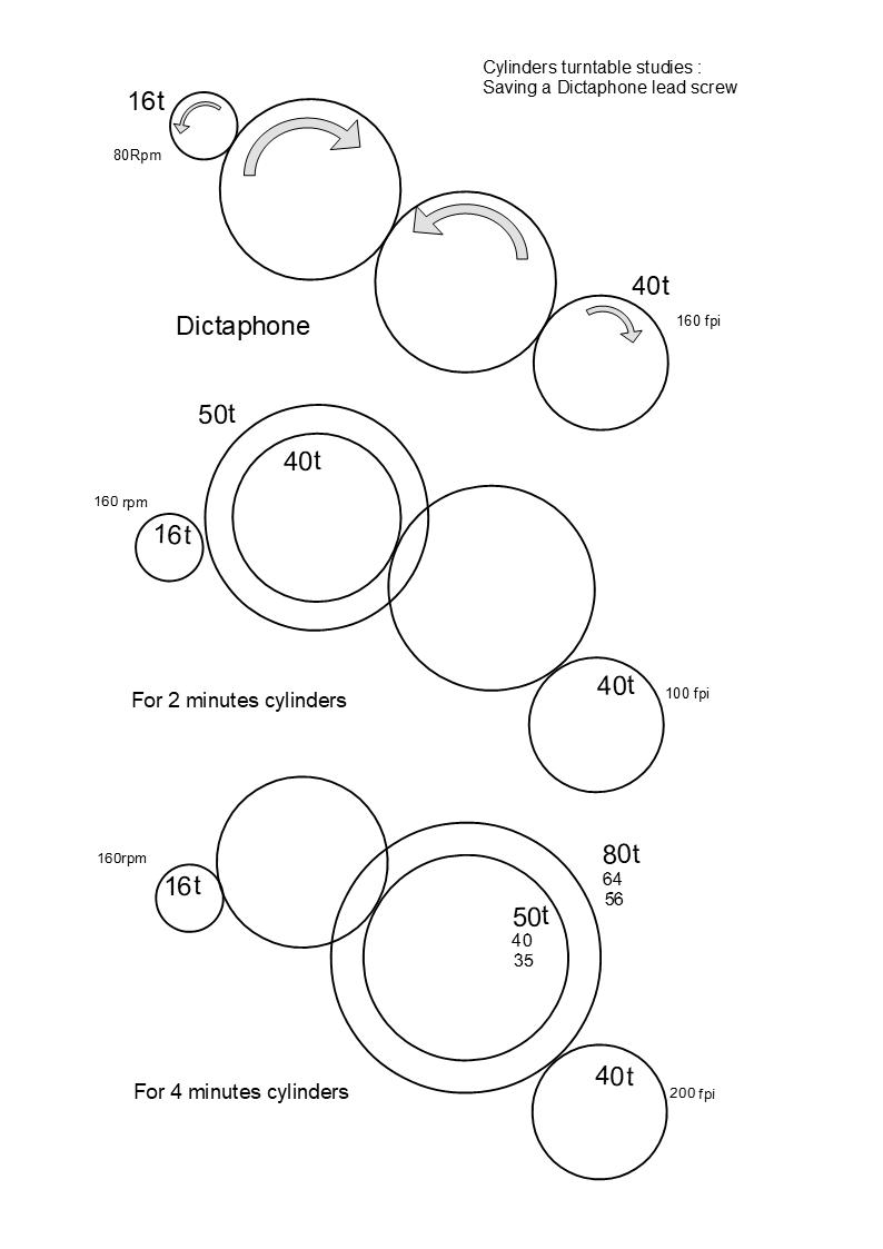 Cylinders Dictaphone: 80 rpm engraving 160 rpi lead screw turning clockwise viewed pinion side (two intermediate pinions)