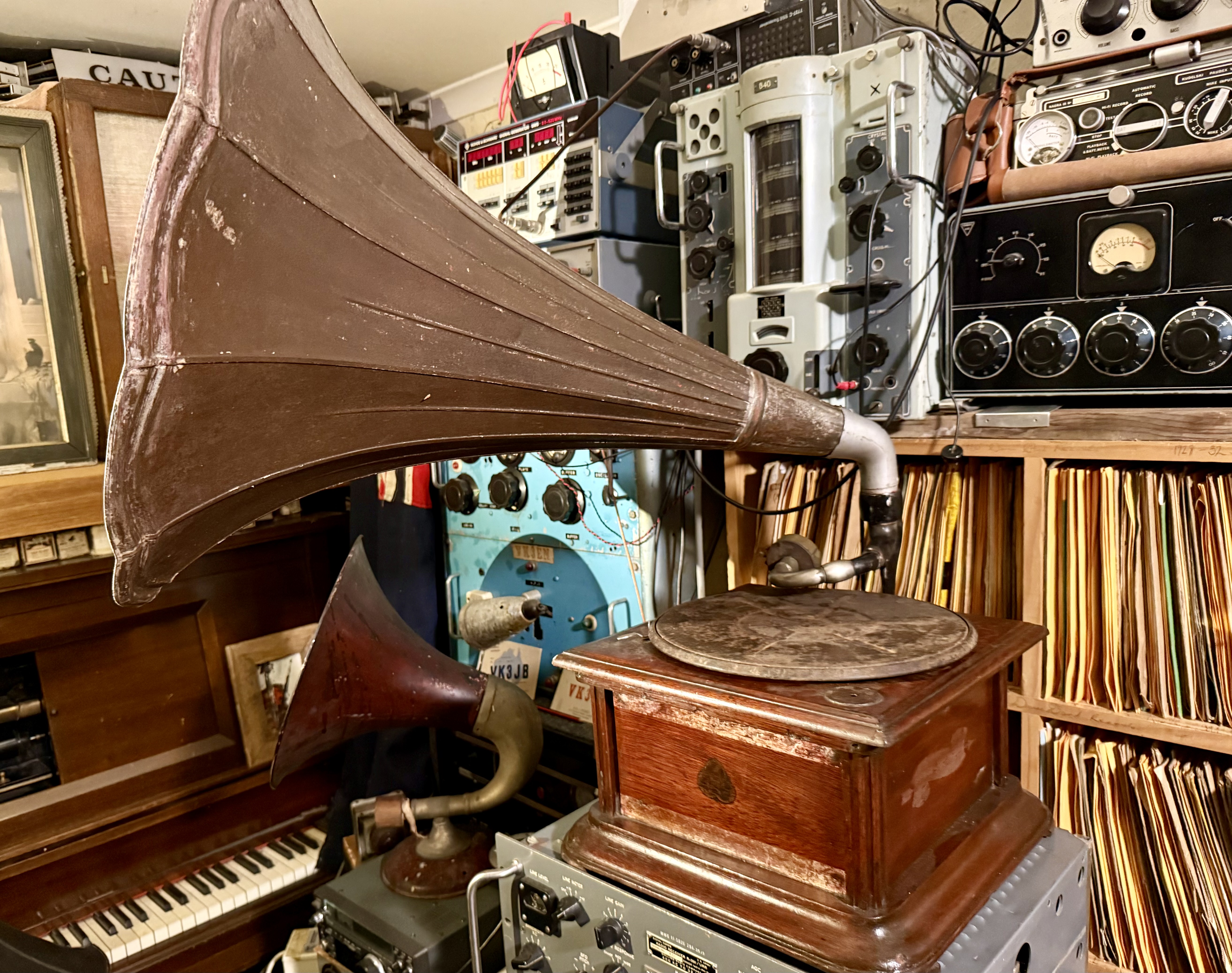 Initially, I bypassed this machine in a junk shop as it appeared to be a modern fake, but on a second glance it seems like it may actually be more Frankenphone than Crapophone - the tone arm has had an extension crudely welded into place but the remaining bracket, horn and case seem to be original. Unfortunately the cabinet has had heavy lacquer applied requiring stripping and refinishing, but it is very solid. There is the remains of an earlier ‘crank hole’ (blocked up) along with the ghost of earlier decals. The platter / soundbox have been changed out more recently with Crapophone parts and a cruddy old Garrard single spring motor was lying in the bottom of the case with a broken spring..