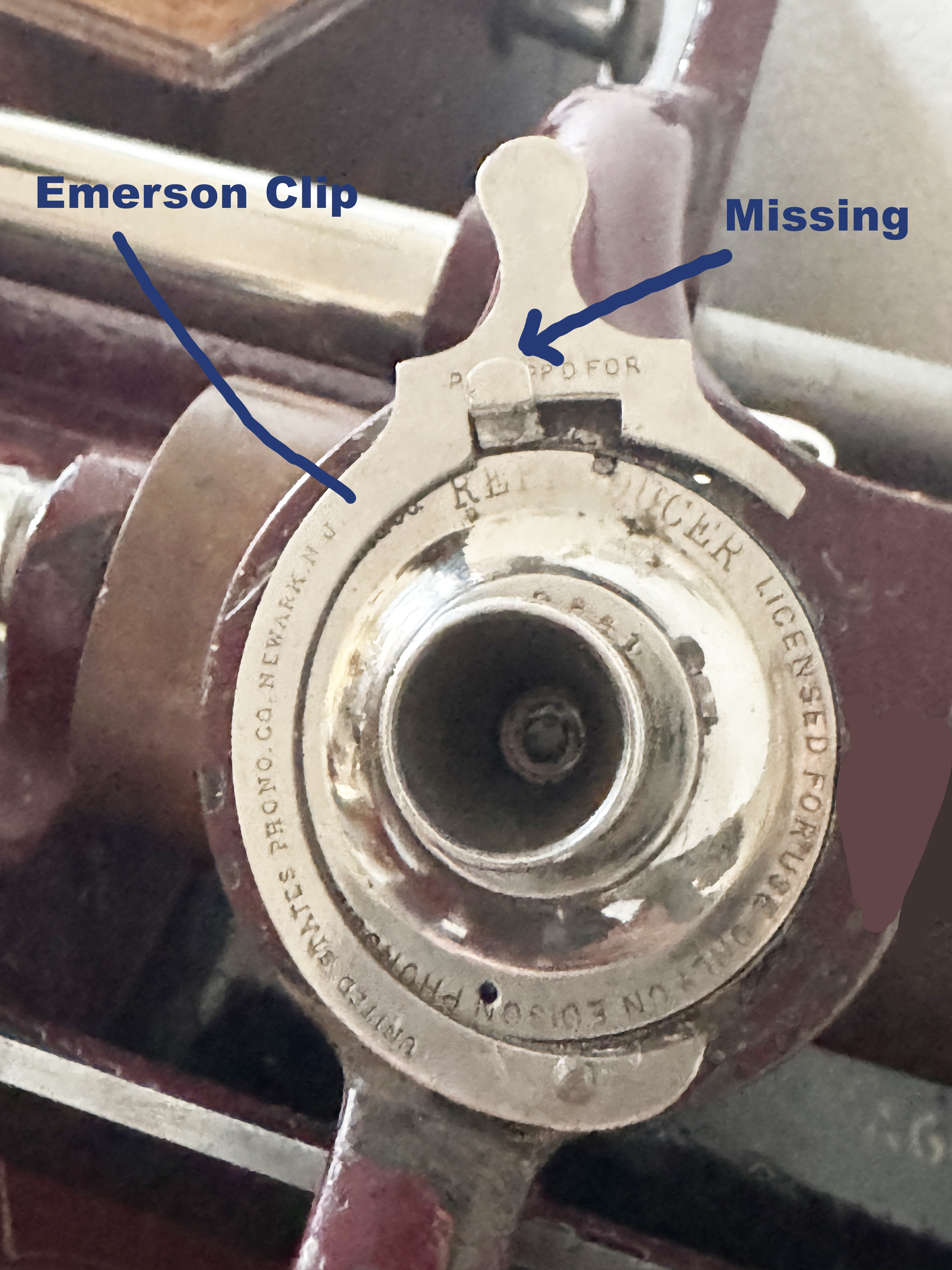 An Emerson clip is a device that makes it easy to take off and replace reproducers. The factory used brackets with 4 screws to hold the reproducer on. Your clip is missing a small piece that acts as a stop when rotating the clip. The United States Phonograph Company used them and stamped their name on them. See pictures provided.....