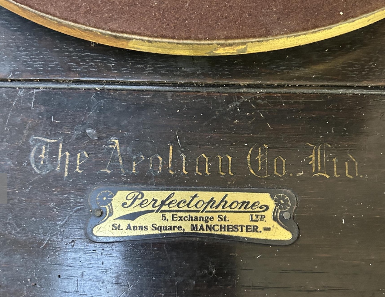 An internet search shows a picture of an Aeolian Co. “Perfectophone” with the Perfectophone plaque mounted at the front of the motor board. Was there a connection between the two companies? Perhaps Aeolian bought the Perfectophone company or the plaque has been added by a seller wishing to make the machine more interesting.
