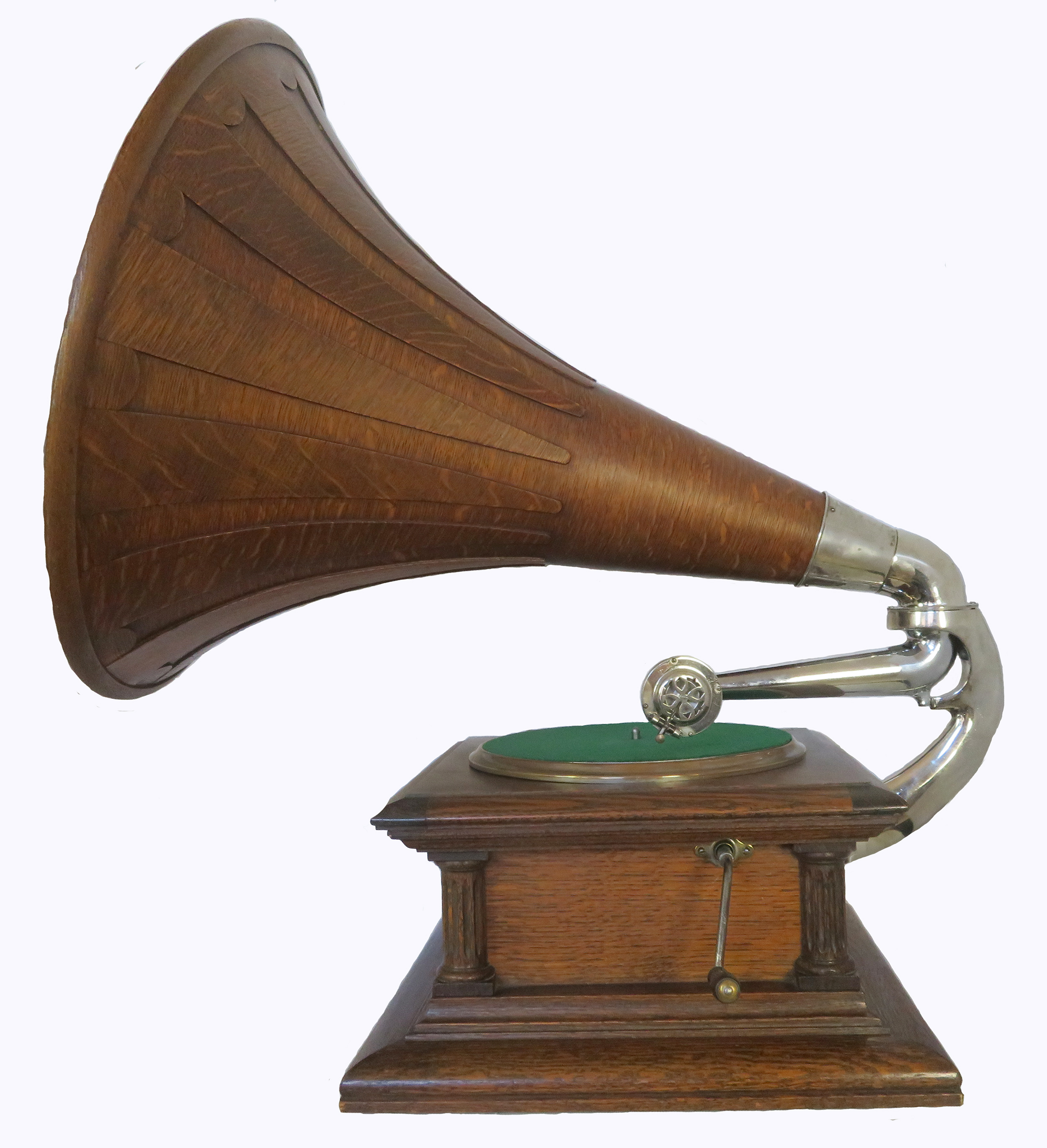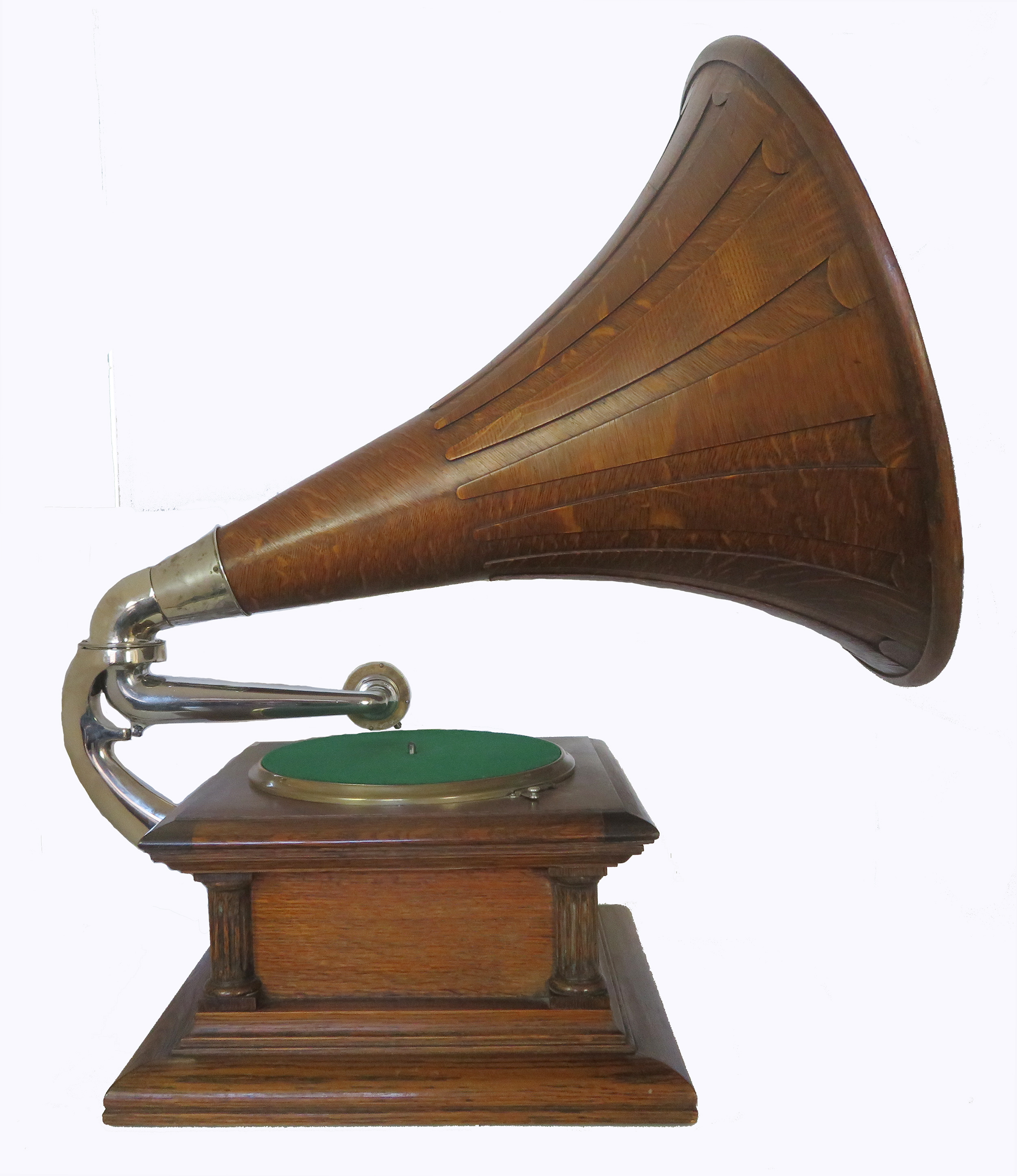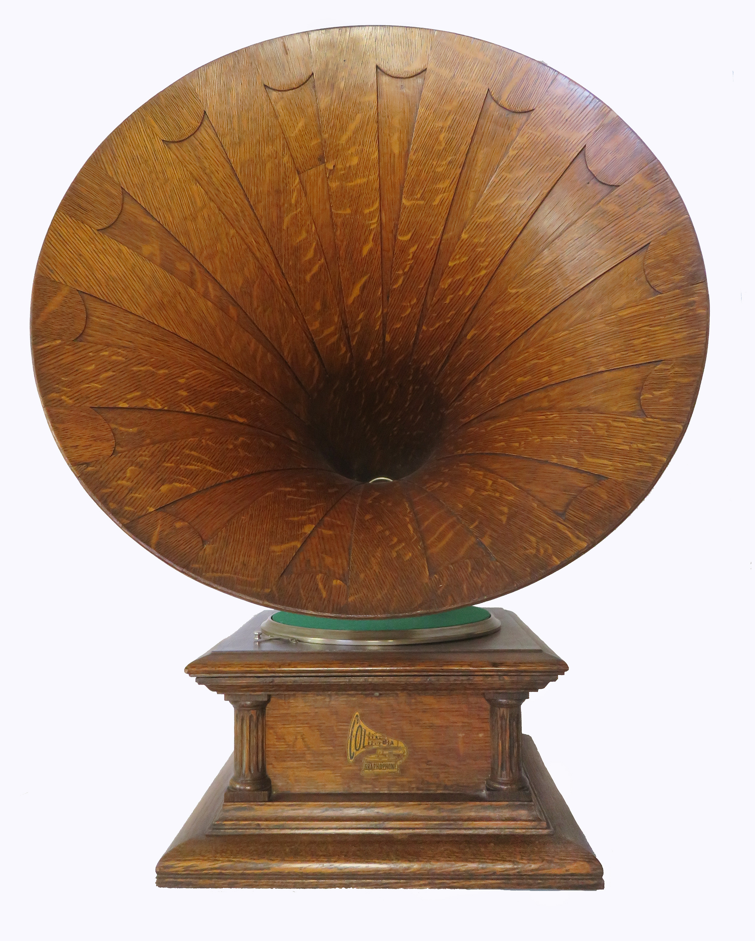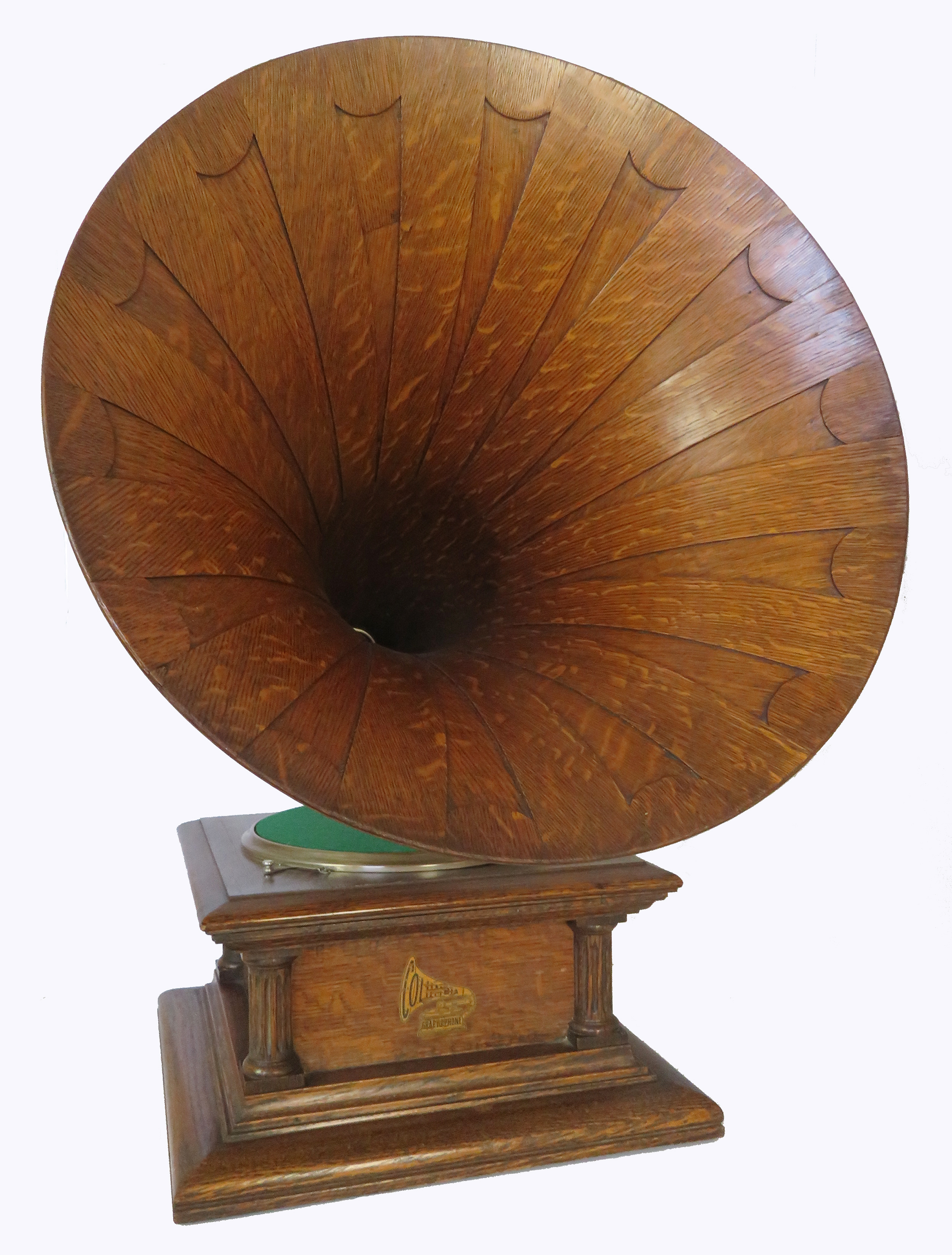 Offering an original Columbia BII with Columbia oak horn. This phonograph has been restored and plays extremely well. The 3-spring motor is strong and smooth, and the rebuilt Columbia Viva-Tonal reproducer has excellent volume. Everything is original except the turntable felt. The back bracket and arm have been replated. The horn measures 21" wide x 23" high.