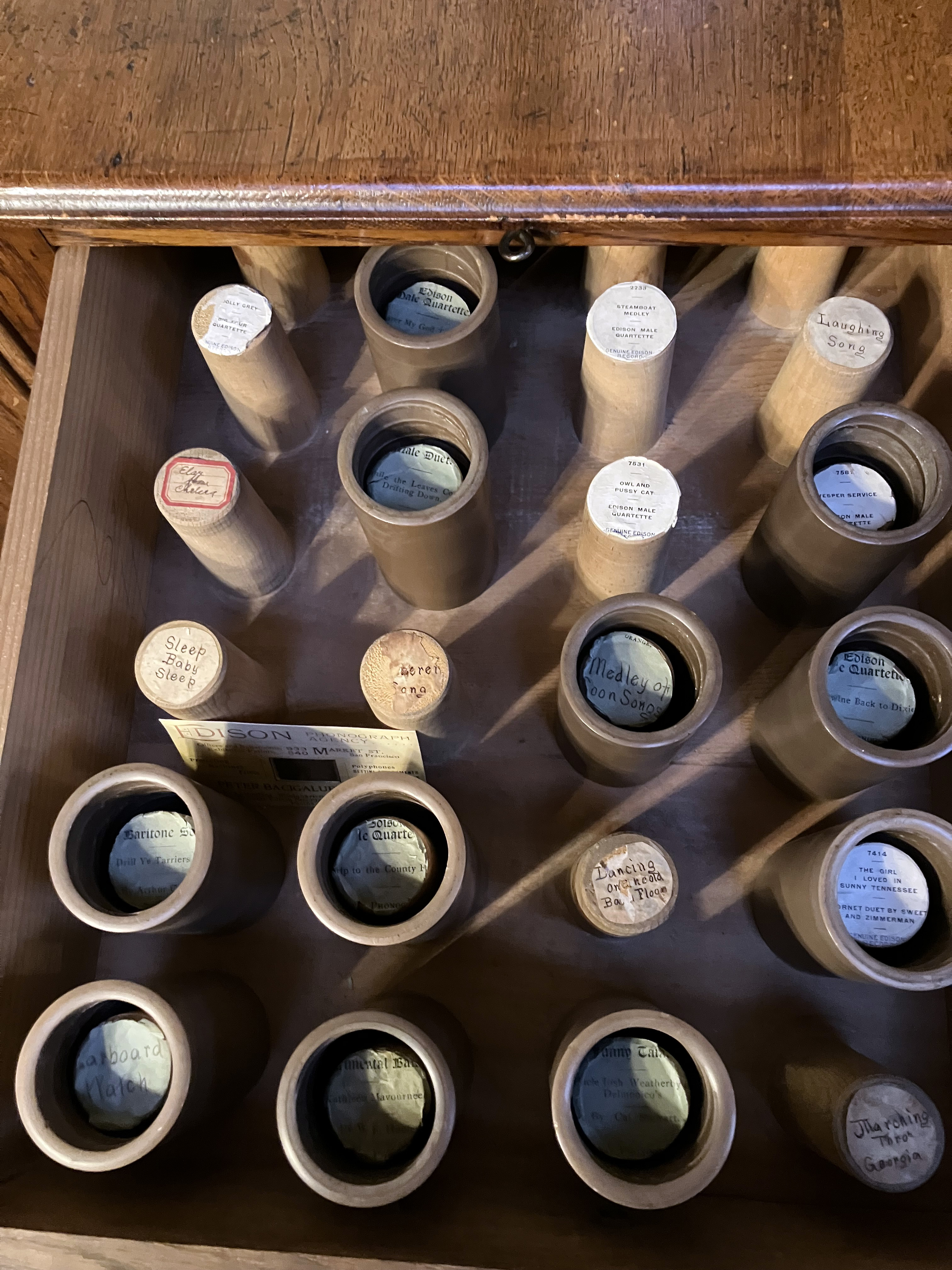 Also, many people cut out the slips which came with Edison and Columbia records and pasted them to the pegs. At some point Edison started putting the title/artist in a circle sized to be cut out for that purpose. Other tags were often handwritten.